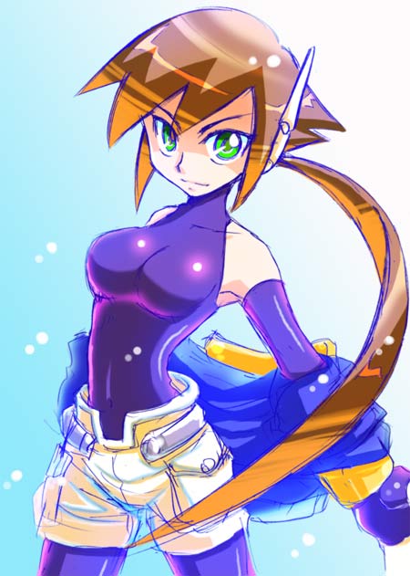 1girlbare shouldersbrown hairfemale focusgreen eyeslong hairponytailrobot earsshortsskin tightsleevelesssolospandex