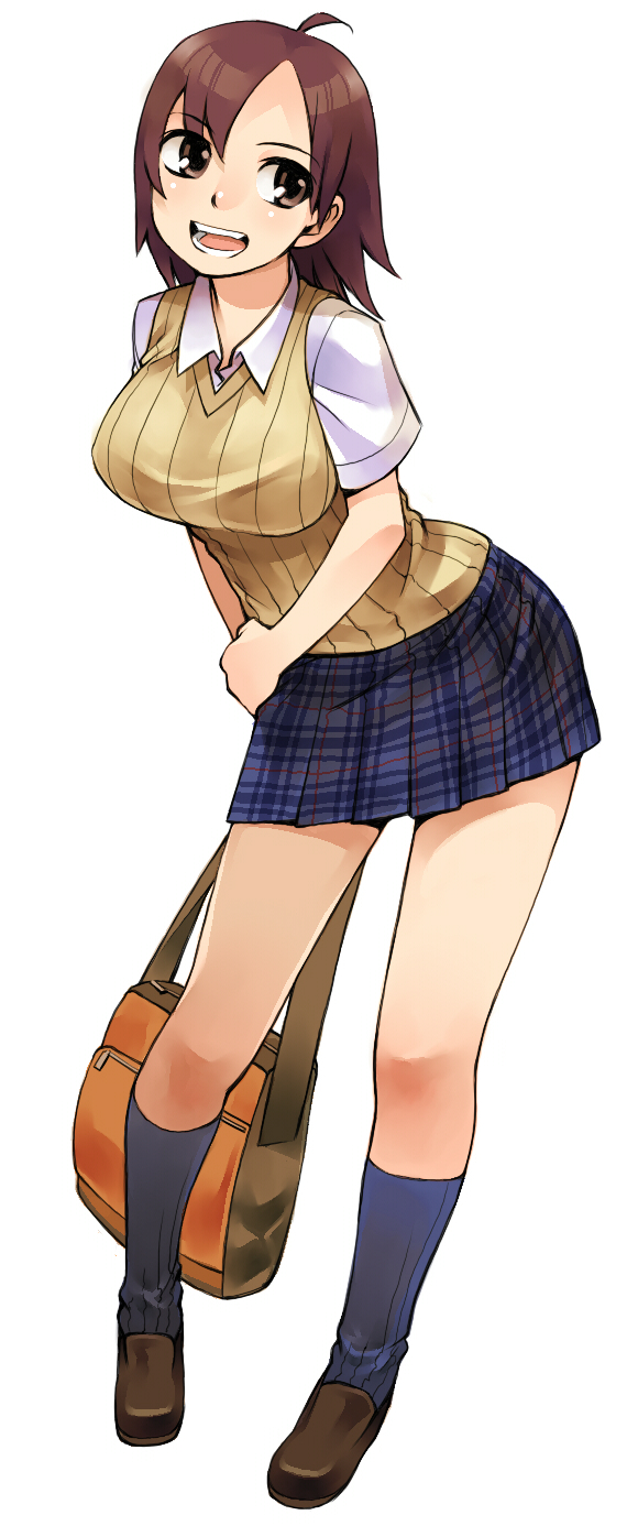yukizuki chikuba, hiiragi kagami, lucky star, suzumiya haruhi no yuuutsu, 00s, 1girl, armband, blue eyes, blue hair, blue skirt, blush, bow, brown bow, dress, female focus, food, fruit, japanese text, legs, lemon, matching hair/eyes, orange armband, plait, purple hair, red bow, sailor dress, school uniform, serafuku, skirt, solo