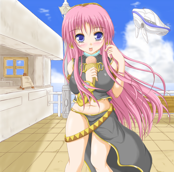 00s1girlblue eyesblushbreastscloudfemale focusfoodice creamlarge breastslong hairlooking at viewermidriffnaveloutdoorspink hairskysolostandingtonguetongue out