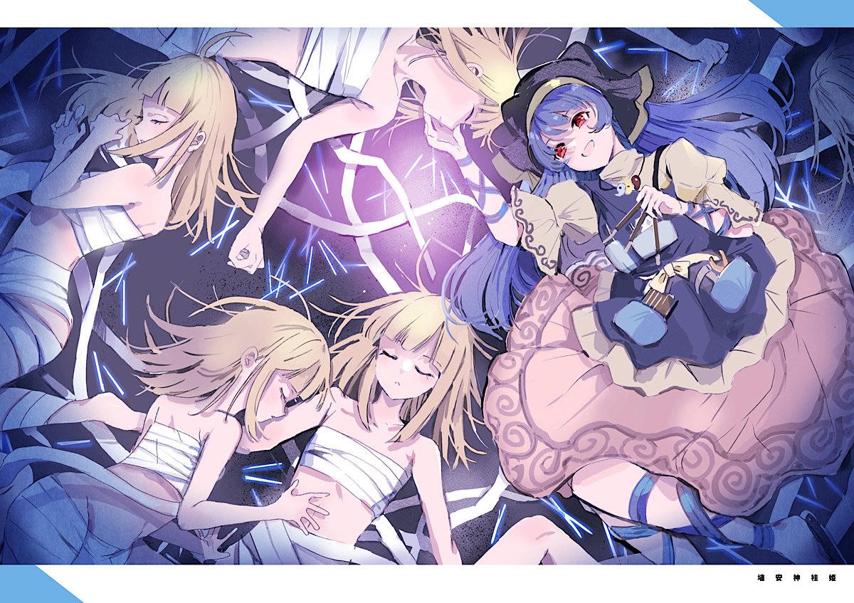 6+girlsbandagesbare shouldersblonde hairblouseblue hairblunt bangschiselclosed mouthflat chestheadscarfjewelrymagatamamultiple girlsnecklaceopen mouthred eyesshirtskirtsmile