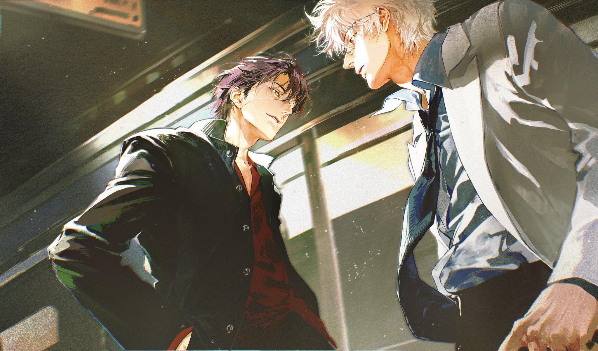 2boysblack jacketblack pantsblue necktieblue shirtcoatcollared shirtdress shirteyepatchformal clothesfrom belowgakuranhand in pockethands in pocketshigh collarindoorsjacketlong sleeveslooking at anothermale focusmultiple boysnecktieopen clothesopen coatopen jacketpantsparted lipspurple hairred shirtschool uniformshirtshort hairsuitteacher and studentwhite coatwhite hairwhite suit