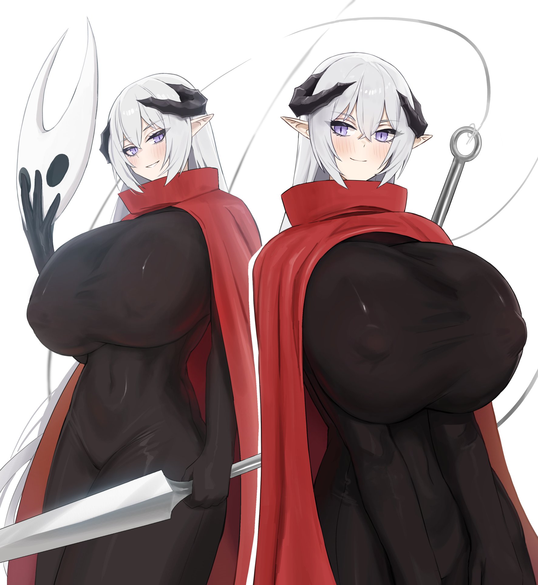 1girlalternate costumeblack bodysuitblack hornsblushbodysuitbreastscloakcosplaycovered erect nipplesholdingholding maskholding weaponhornet (hollow knight) (cosplay)hornshuge breastslong hairmaskmultiple viewsneedle (hollow knight)pointy earspurple eyesred cloaksimple backgroundsmilesolovery long hairweaponwhite backgroundwhite hair