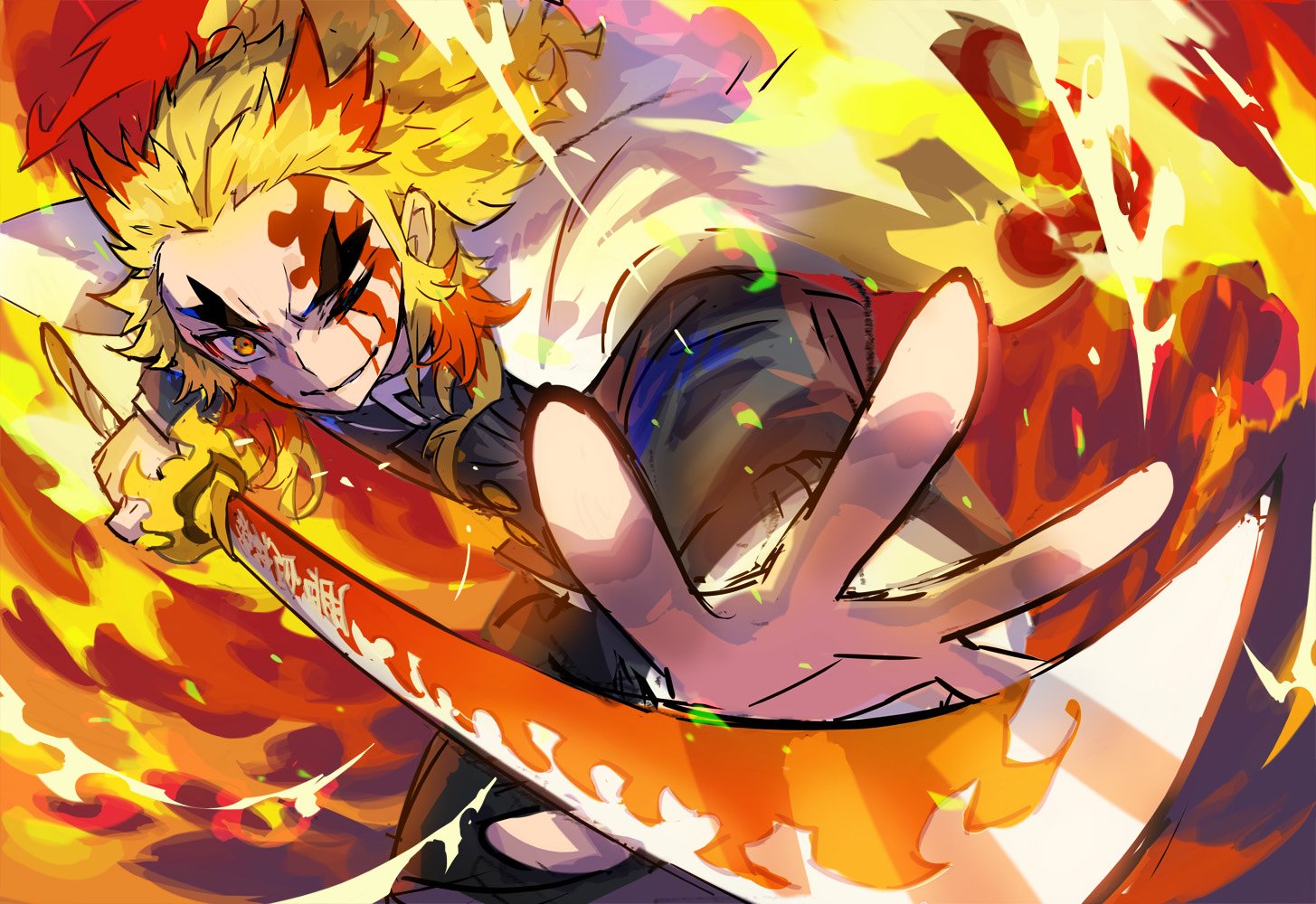 1boyblack pantsblonde hairdemon slayer uniformfireholdingholding swordholding weaponjapanese clotheskatanalong sleeveslooking at viewermale focusmulticolored hairone eye closedpantsred hairsmilesoloswordtwo-tone hairweaponyellow eyes