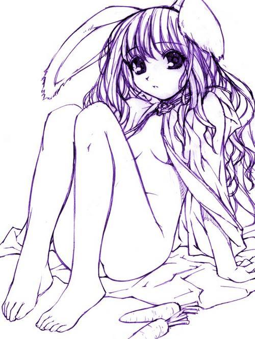 1girlanimal earsbarefootbottomlessbreastscarrotfeetfemale focusmonochromeopen clothesopen shirtrabbit earsshirtsittingsketchsmall breastssolotoes