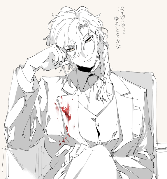 1boybloodblood on clothesbraidbrown backgroundchairclosed mouthcollared shirtelbow restfacing viewerformal clotheshair between eyeshair over shoulderhand on laphead restjacketlight smilelong sleeveslooking downmale focusmedium hairmonochromenecktieon chairpantsparted bangsshirtsimple backgroundsingle braidsittingsketchsolospot colorsuitvestyellow eyes