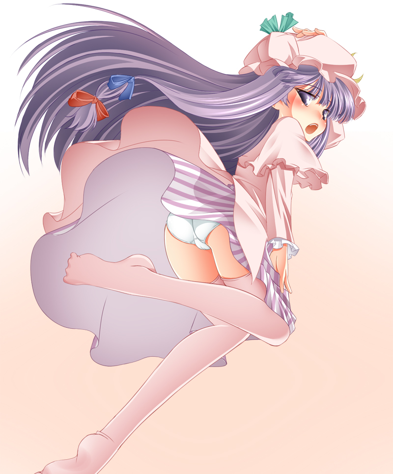 1girlcrescent hat ornamentfeetfemale focushair ribbonhathat ornamentlong hairpantiespurple eyespurple hairribbonsolothighhighsunderwearwhite pantieswindwind lift
