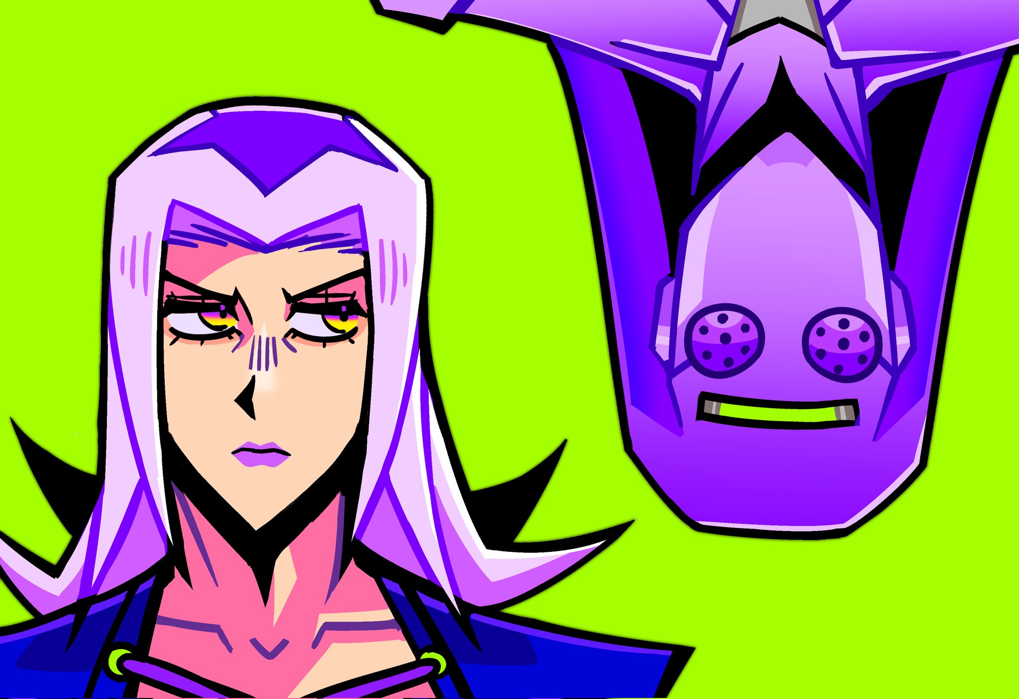 1boy1othercoatcollarbonecolored skingreen backgroundgrey hairlong hairlooking at anothermakeupmale focusmulticolored hairpurple coatpurple hairpurple lipspurple skinspiked hairstand (jojo)two-tone hairupside-downyareyaredajyellow eyes