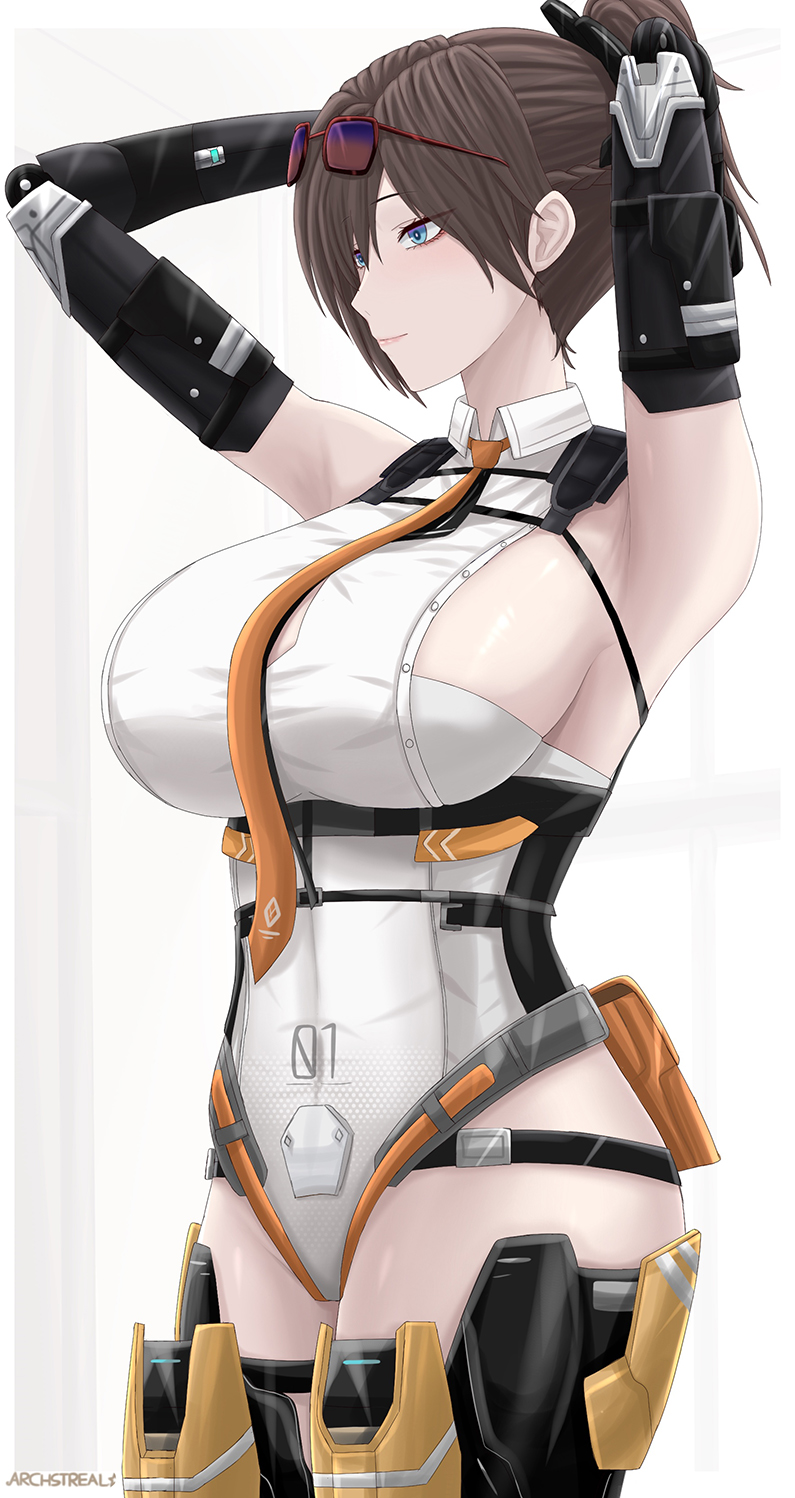1girlarmpitsarms upbare shouldersblue eyesbodysuitbreastsbrown hairbutton gapchest harnessclosed mouthcollared leotardcowboy shoteyewear on headhair between eyesharnesslarge breastsleotardmechanical armsmechanical legsmulticolored bodysuitnecktieorange necktiepouchsideboobsidelockssignaturesolostandingsunglassestwo-tone bodysuittying hairwhite backgroundwhite leotard
