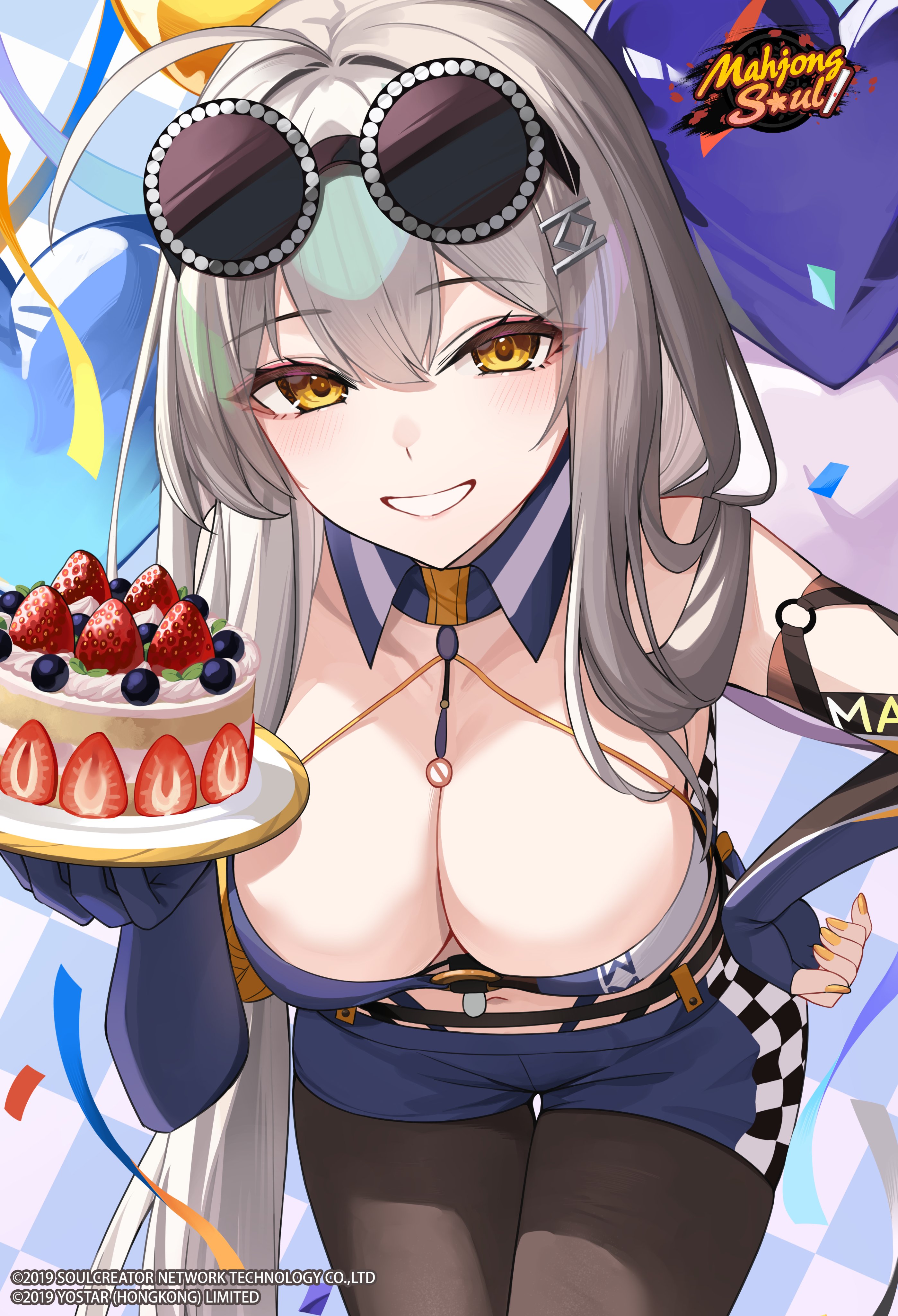 1girlahogeasymmetrical glovesballoonbirthday cakeblack pantyhoseblue glovesbreastscakecleavageelbow gloveseyewear on headfingerless glovesfoodglovesgrey hairheart balloonlarge breastsleaning forwardlong hairlooking at viewermismatched glovesnavelpantyhoserace queenround eyewearshortssmilesunglassesyellow eyesyellow nails