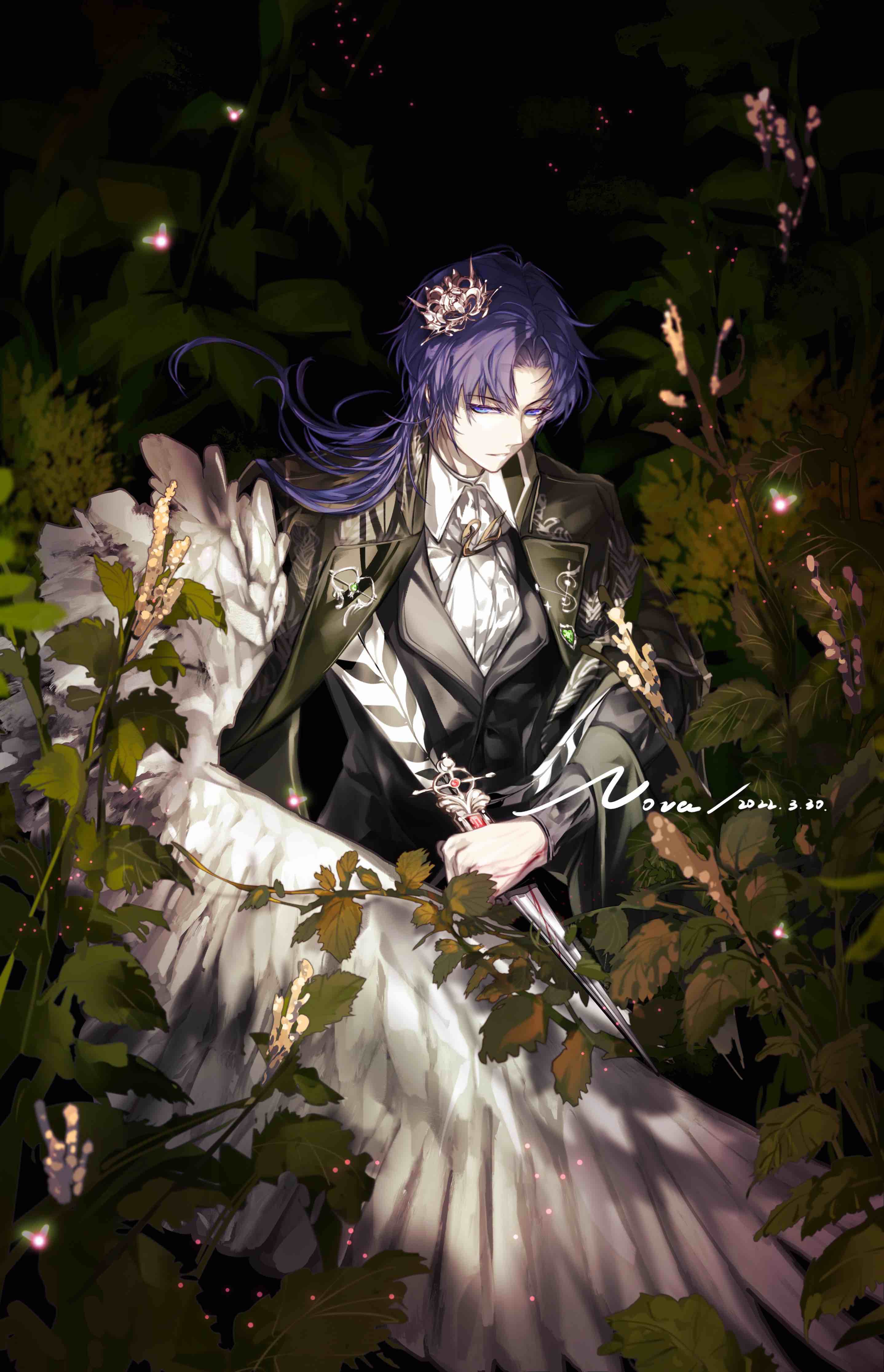 1boyartist nameascotbird wingsblack jacketbleedingbloodbloody knifeblue eyesblue hairbroochcoatcollared coatcollared shirtcrowncurtained hairdaggerdatedfeathered wingsgreen coatholdingholding bladeholding daggerholding knifeholding weaponjacketjewelryknifelapel pinlight smilelong hairlong sleevesmale focusmini crownmolemole under eyenettlenightofficial alternate costumeparted bangsparted lipsplantreverse gripshirtsideways glancesingle wingsolotilted headwearupper bodyweaponwhite ascotwhite shirtwhite wingswinged armswings