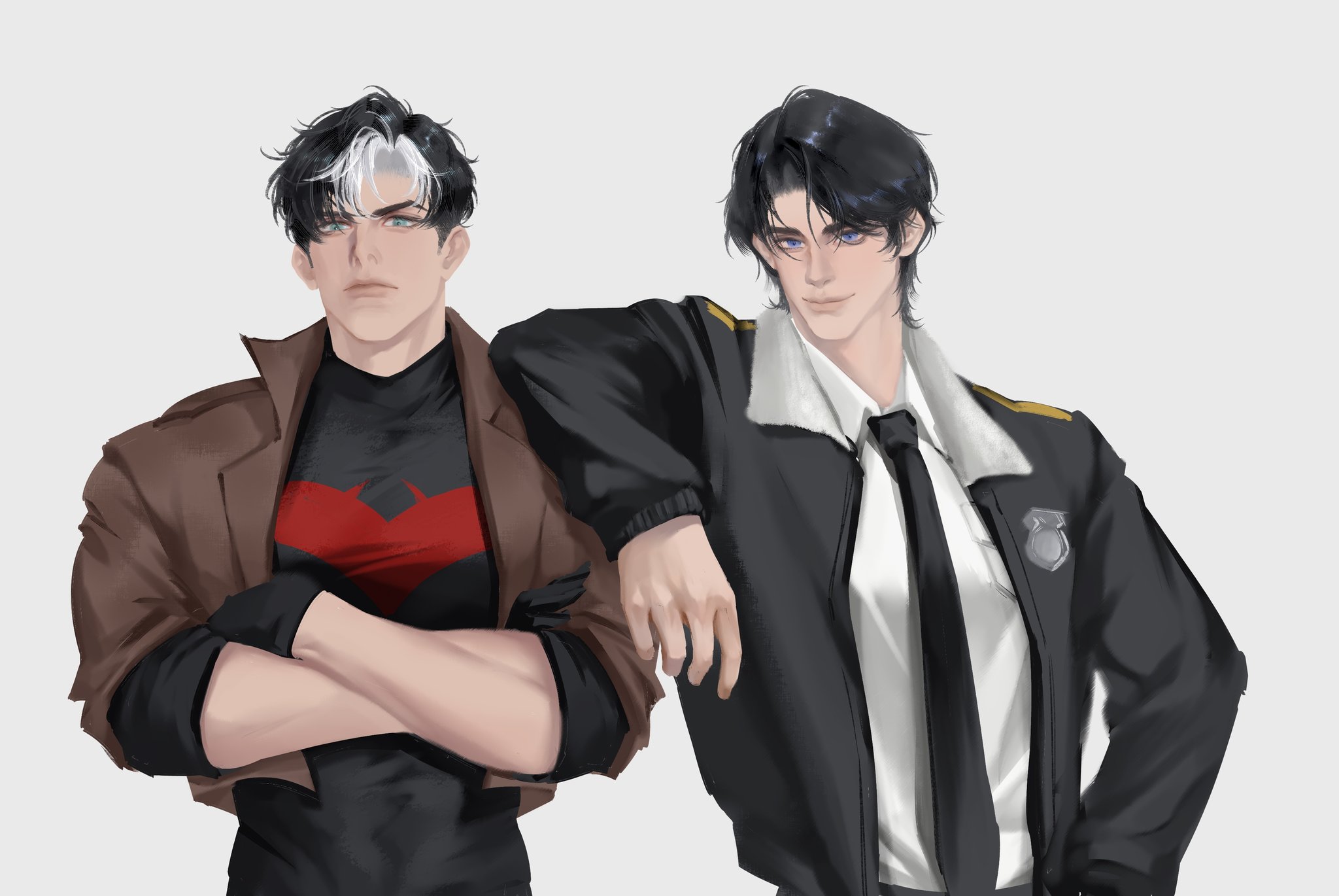 bat signalbatman symbolblack bodysuitblack glovesblue eyesbodysuitbrown jacketglovesgrey bodysuitichinosegukijacketmale focusmulticolored bodysuitmultiple boysmuscularmuscular maleopen clothespantspolicepolice uniformred hood and the outlawsshort hairsuperhero costumetaut bodysuittwo-tone bodysuit