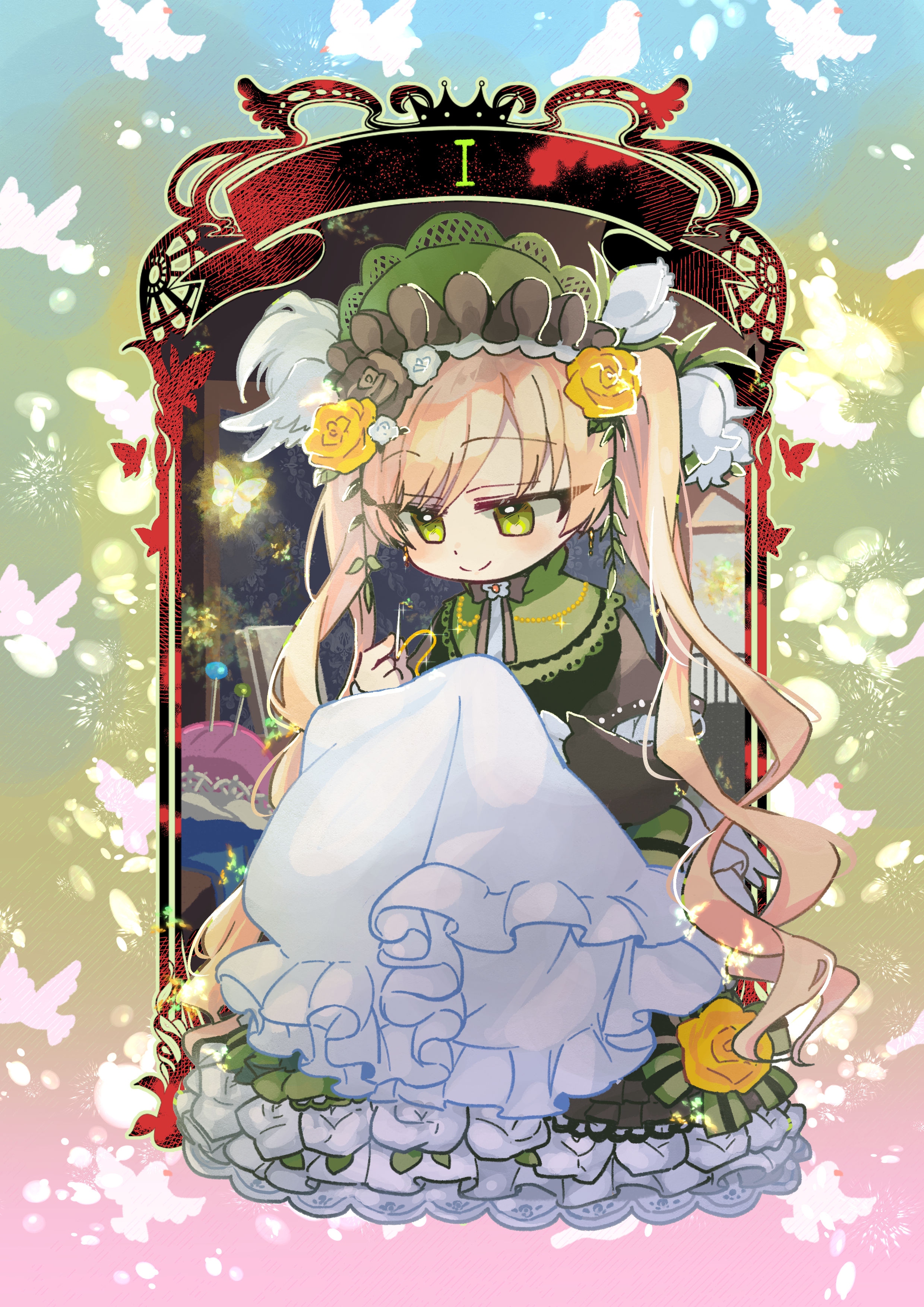 1girlblonde hairbugbutterflychibichibi onlyclosed mouthdressfrilled dressfrillsfull bodygreen dressgreen eyesholding clothholding sewing needleinsectlong hairlong sleeveslooking downmagical girlnamaeyondehosiineedlepincushionred butterflysewingsewing needlesittingsmilesolotwintailsvery long hair