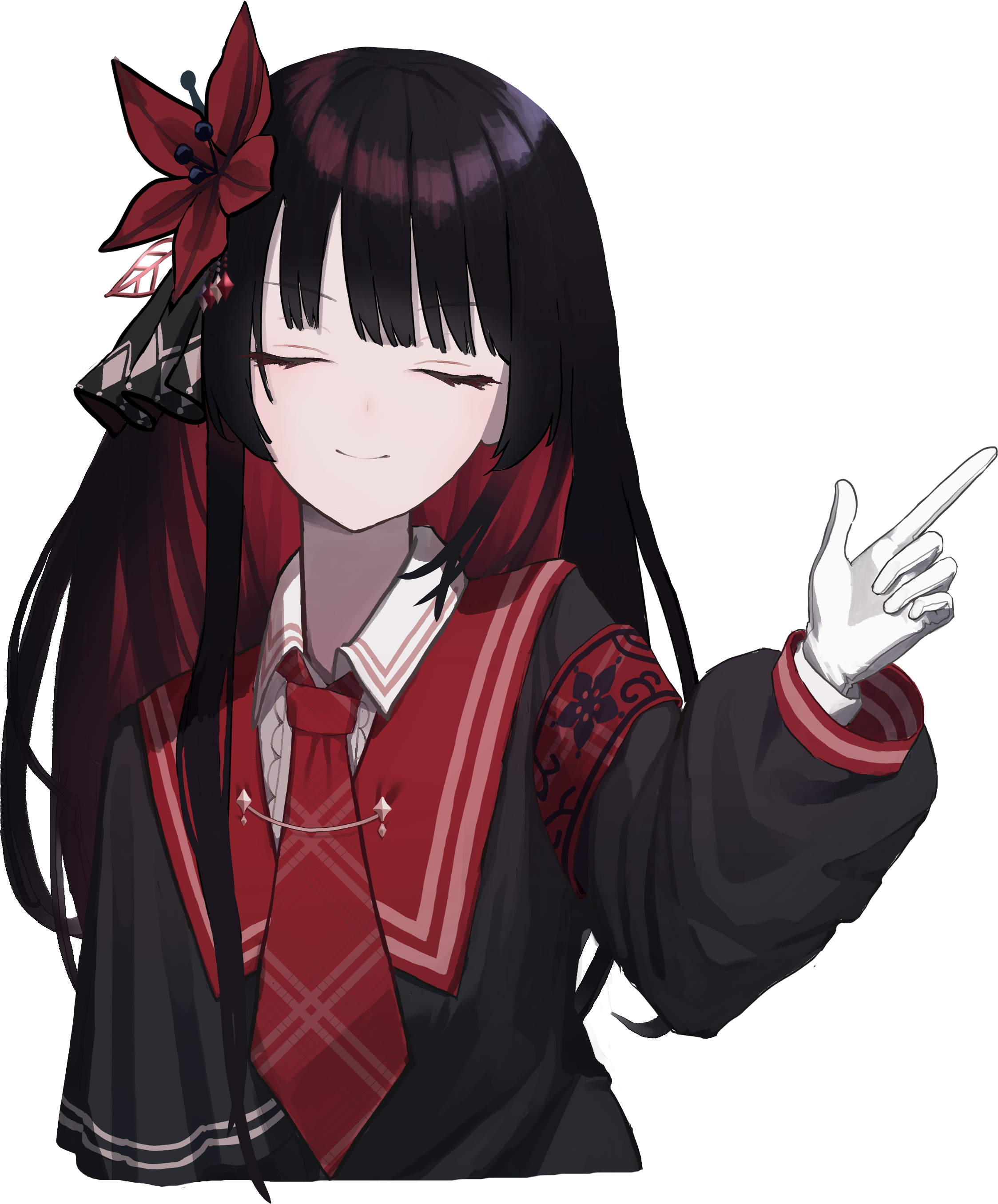 1girlarmbandblack hairblunt bangsclosed eyesclosed mouthcollared shirtcrownfacing viewerflowergloveshair flowerhair ornamenthand upindex finger raisedlong hairlong sleevesmagical girlnecktiered armbandred flowerred necktiered sailor collarsailor collarshirtsimple backgroundsmilesolotransparent backgroundupper bodywhite gloves