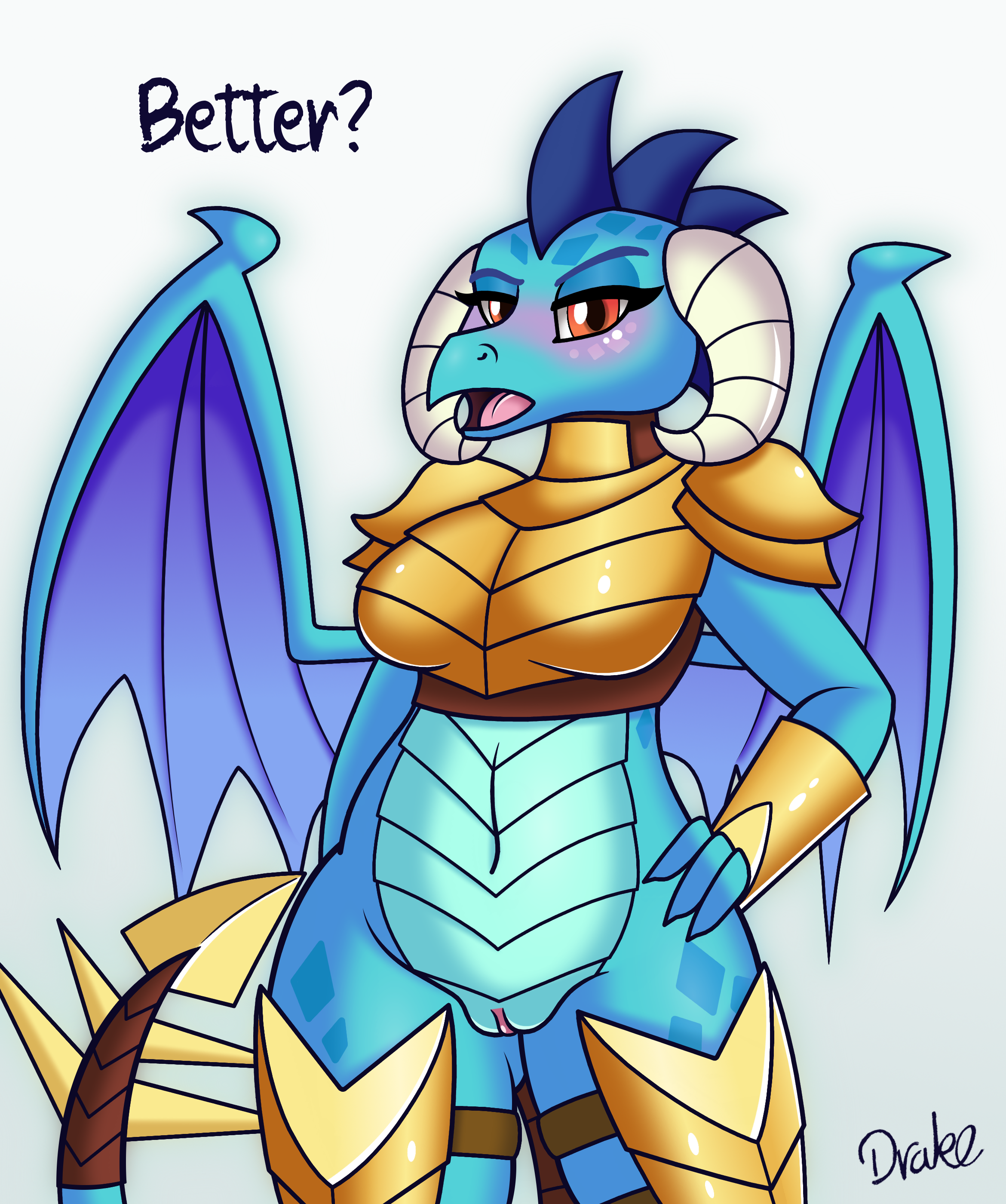 anthroarmorblushbottomlessclothedclothingdialoguedragonfemaleFlag for Deletionhalf-closed eyeshand on hiphornlegwearlooking at viewermembranous wingsnavelopen mouthpussyred eyesscaliesolowings
