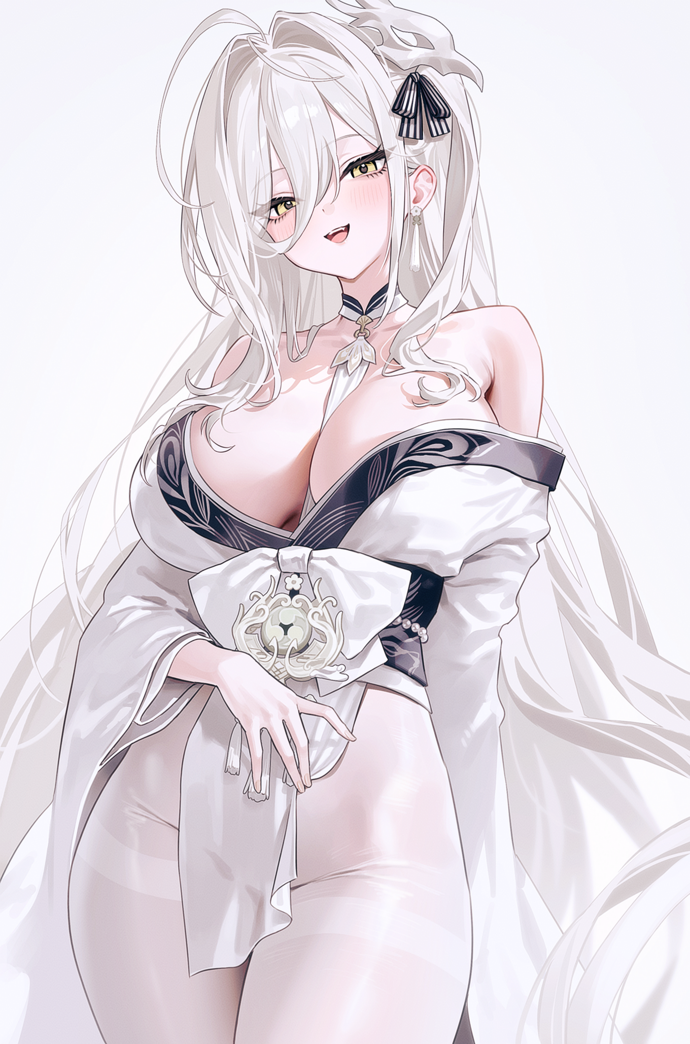 1girlbird maskblushbreastscleavagecowboy shotearringshair between eyeshair intakeshair ornamentjapanese clothesjewelrykimonolarge breastslong bangslong hairlong hair between eyeslooking at viewermaskmask on headopen mouthpantyhosepelvic curtainshort kimonosimple backgroundsmilesolotasselvery long hairwhite backgroundwhite hairwhite kimonowhite pantyhosewide sleevesyellow eyes