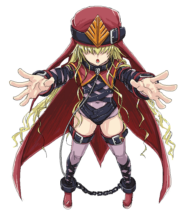 00s1girlankle cuffsbdsmblonde hairbondagebondage outfitboundcapechaincovered navelcurly hairdot nosefemale focusfull bodyhair over eyeshathat beltjaggy lineslong hairnaveloekakiopen mouthoutstretched armsred capered veilsimple backgroundsoloteeththigh strapthighhighstongueveilwhite background