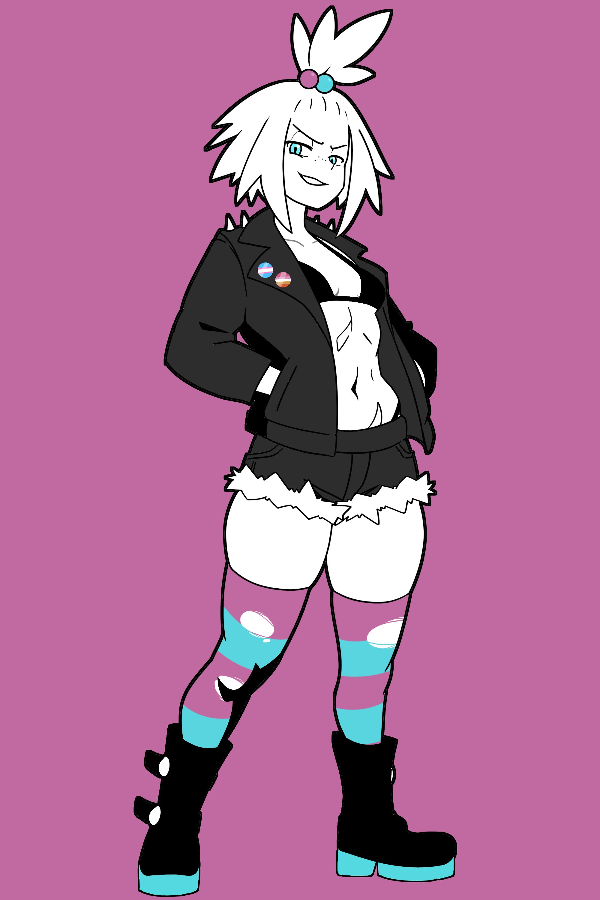 1girlalternate costumeaqua eyesbadgeblack bootsblack brablack jacketblack shortsbootsbrabutton badgecollarboneflat colorfrecklesfull bodyhair bobbleshair ornamenthands in pocketjacketlong sleevesmedium hairnavelopen clothesopen jacketpurple backgroundshort shortsshortssimple backgroundsmilesolostandingstomachstriped clothesstriped thighhighsthighhighstonedtoned femaletopknottorn clothestorn shortstorn thighhighstwo-tone thighhighsunderwearwhite hairzettai ryouiki