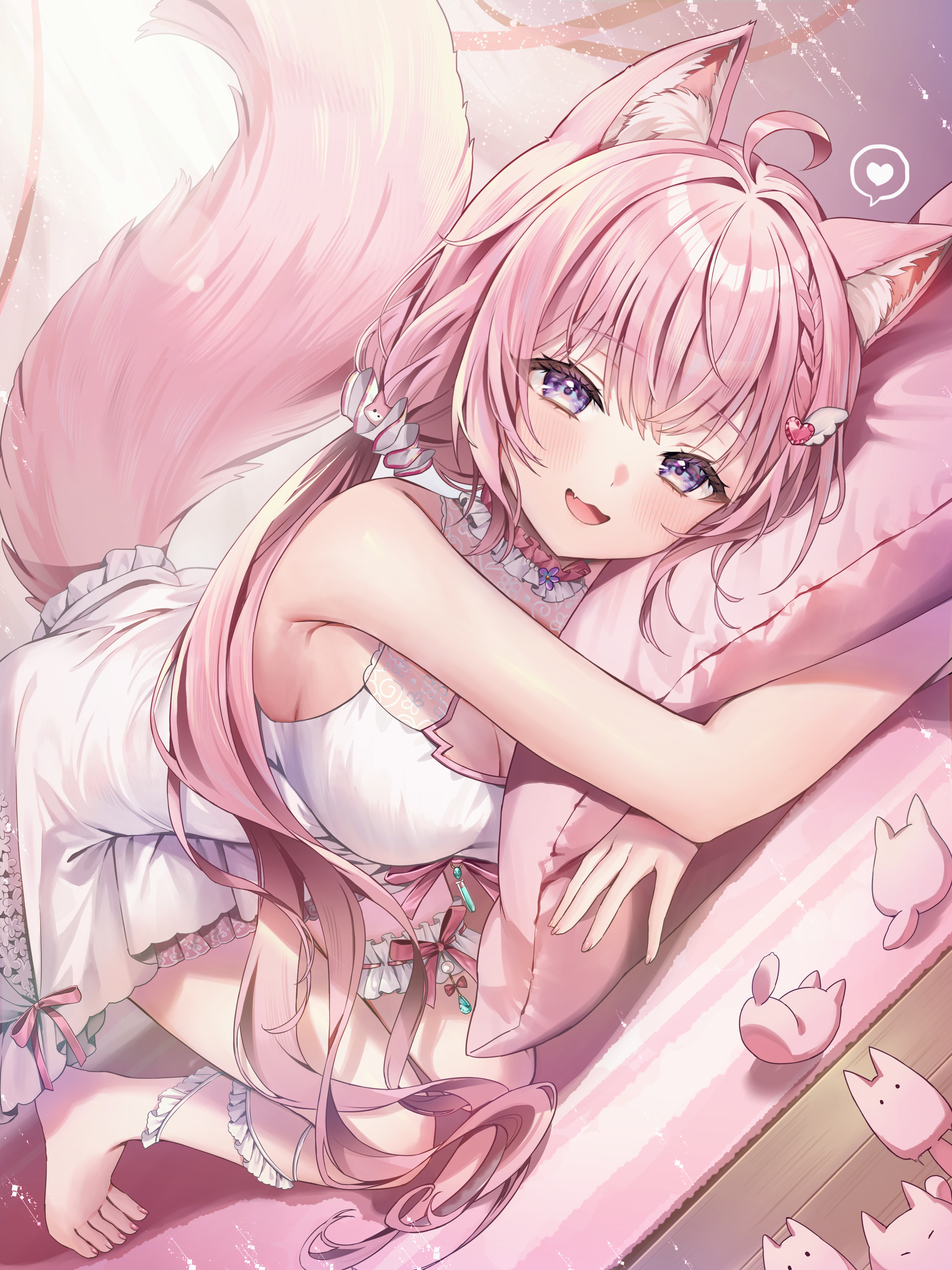 :dahogeanimal earsantenna hairbarefootbraidbreastschokercleavage cutoutclothing cutoutdouble-parted bangsdressfangfrilled chokerfrilled dressfrilled thigh strapfrillshair ornamenthair scrunchiehalter dresshalterneckhearthugging objectindoorslarge breastslong hairlooking at viewerlow twintailsnightgownofficial alternate costumeofficial alternate hairstyleon bedopen mouthpillowpillow hugpink chokerpink hairpink tailpurple eyesscrunchieshort dressside braidsleevelesssleeveless dresssmilespoken hearttailthigh straptop-down bottom-uptwintailsvery long hairvirtual youtuberwhite dresswhite nightgownwing hair ornamentwolf earswolf girlwolf tail