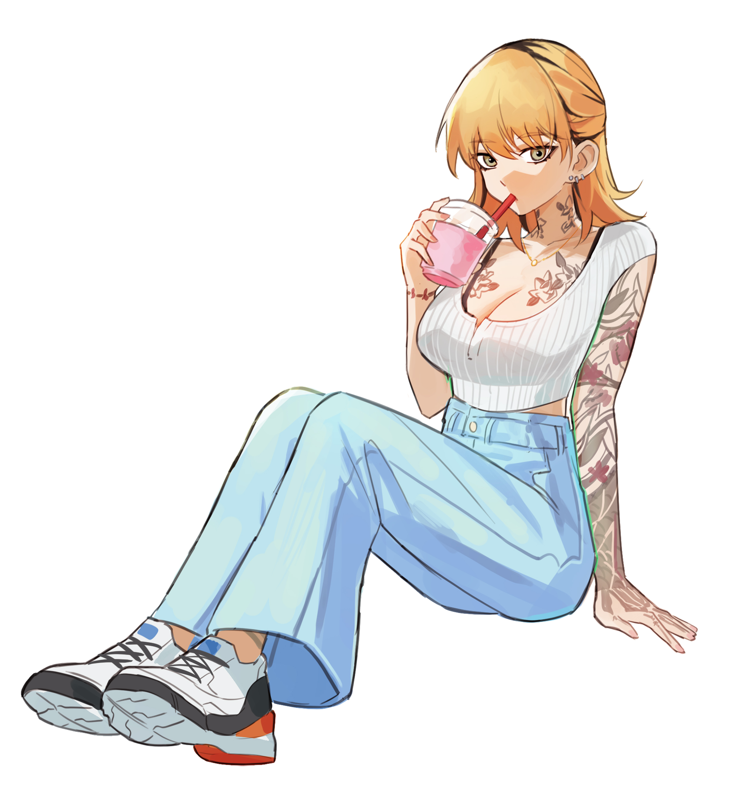 1girlarm tattooblack streaksblonde hairblue pantsbra strapbreastsbrown eyeschest tattoochoppy bangscleavagecupdenimdisposable cupdrinkingdrinking strawdrinking straw in mouthearringsfull bodyholdingholding cupjeansjewelrylarge breastslooking at viewermedium hairmulticolored hairmultiple tattoosneck tattoonecklacepantsshirtshoesshort sleevessimple backgroundsittingsneakerssolostreaked hairtattoowhite backgroundwhite shirtwhite shoes