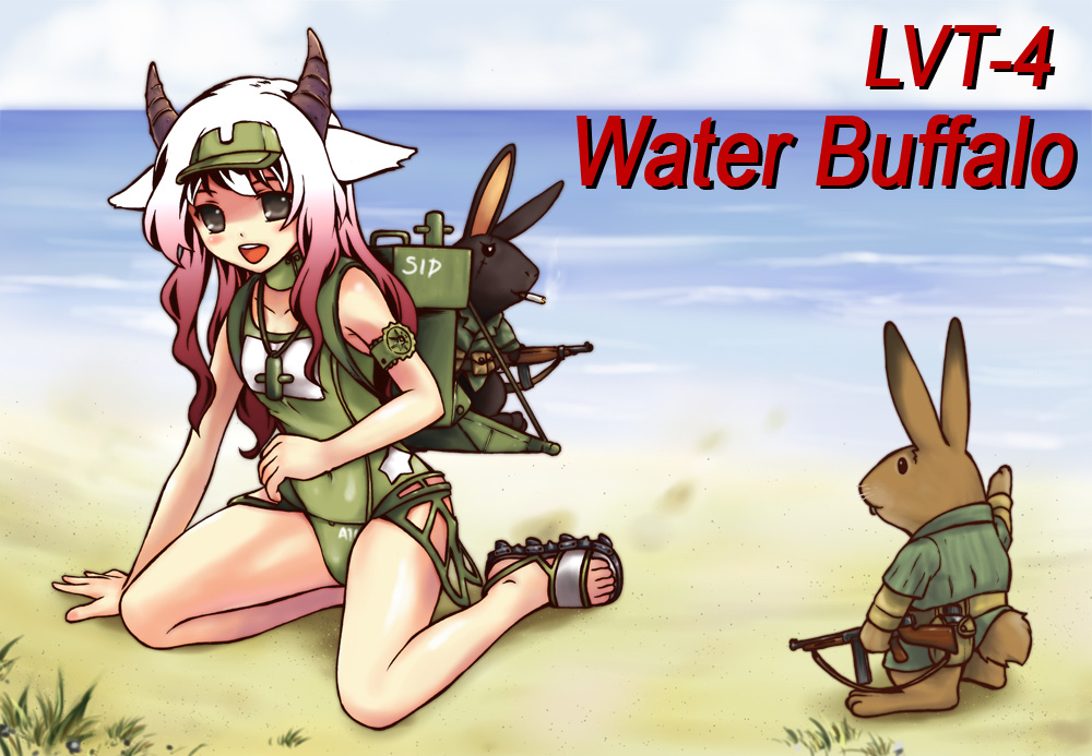 1girlanimal earsbackpackbackpack unitbagbeachdayfemale focusgreen one-piece swimsuithornslong hairmecha musumemilitaryone-piece swimsuitrabbitsandalsschool swimsuitsoloswimsuitwhite hairworld war ii