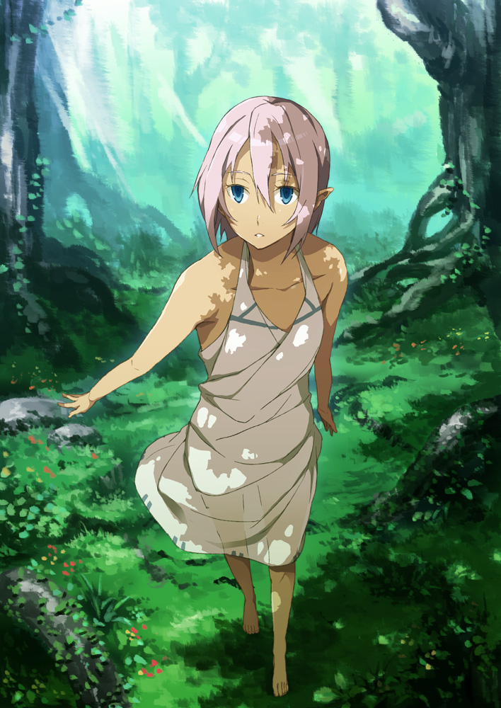 1girlbarefootblue eyesdaydresselffemale focusforestgrassnatureparted lipspink hairpointy earssee-through silhouettesolosundresstreewhite dress
