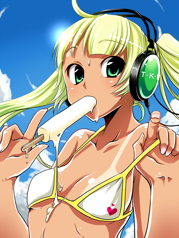 zet (twt zet), original, commentary, english commentary, highres, +++, 1girl, ahoge, alternate hair color, bikini, black bikini, black choker, black nails, blonde hair, blue eyes, blue hair, blue sky, blush, border, breasts, brown hair, choker, cloud, colored inner hair, cowboy shot, dark-skinned female, dark skin, day, doyagao, eyelashes, eyewear on head, gradient hair, hand on own hip, large breasts, leaning forward, meru (twt zet), mole, mole on breast, multicolored hair, nail polish, navel, open mouth, round eyewear, short hair, signature, sky, smile, smug, solo, stomach, sunglasses, swimsuit, tan, tanline, white border