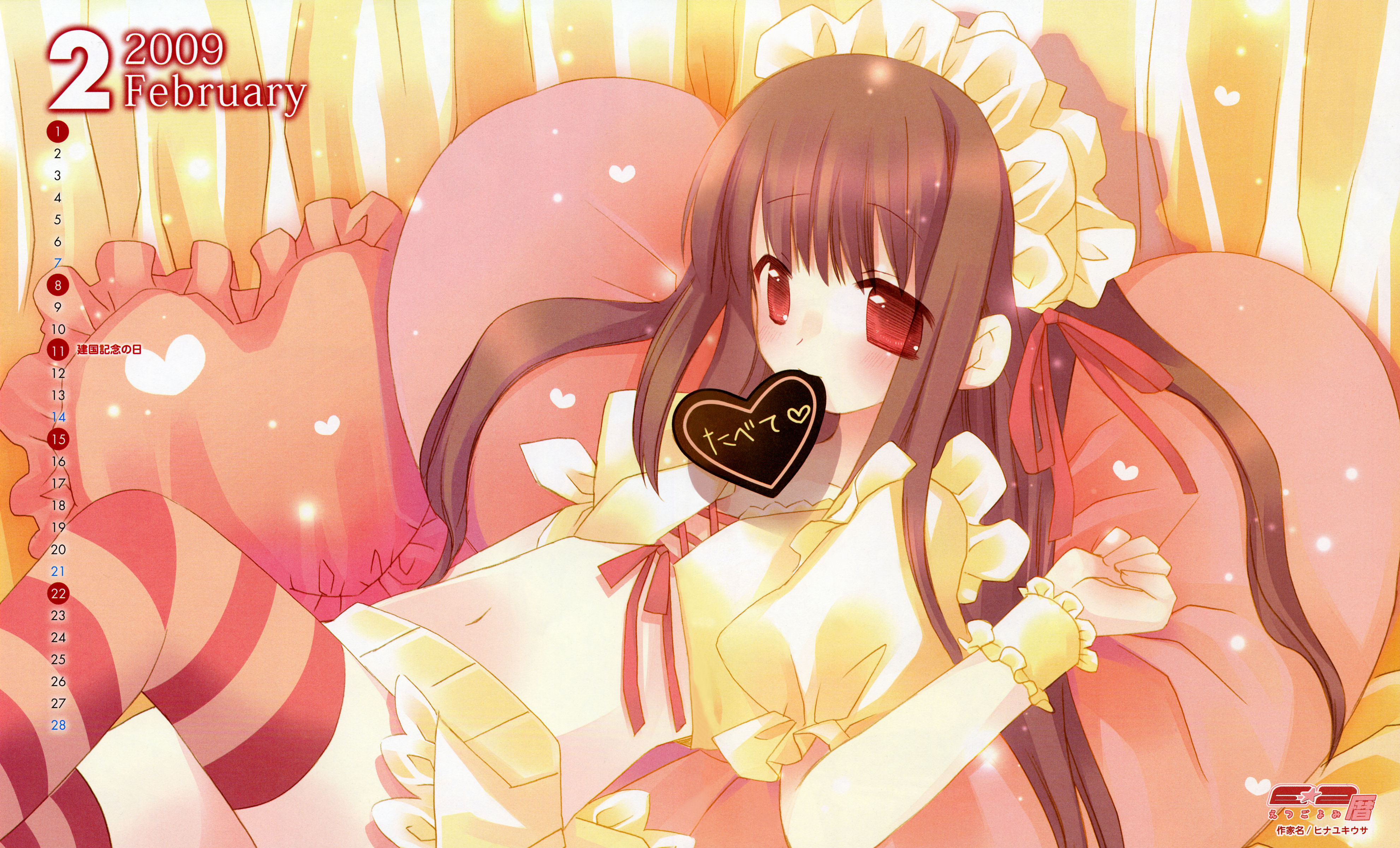 1girlbrown hairfemale focusflat chestfrilled pillowfrillsheartheart-shaped pillowlong hairmidriffnavelpillowred eyessockssolostriped clothesstriped socksstriped thighhighsthighhighs