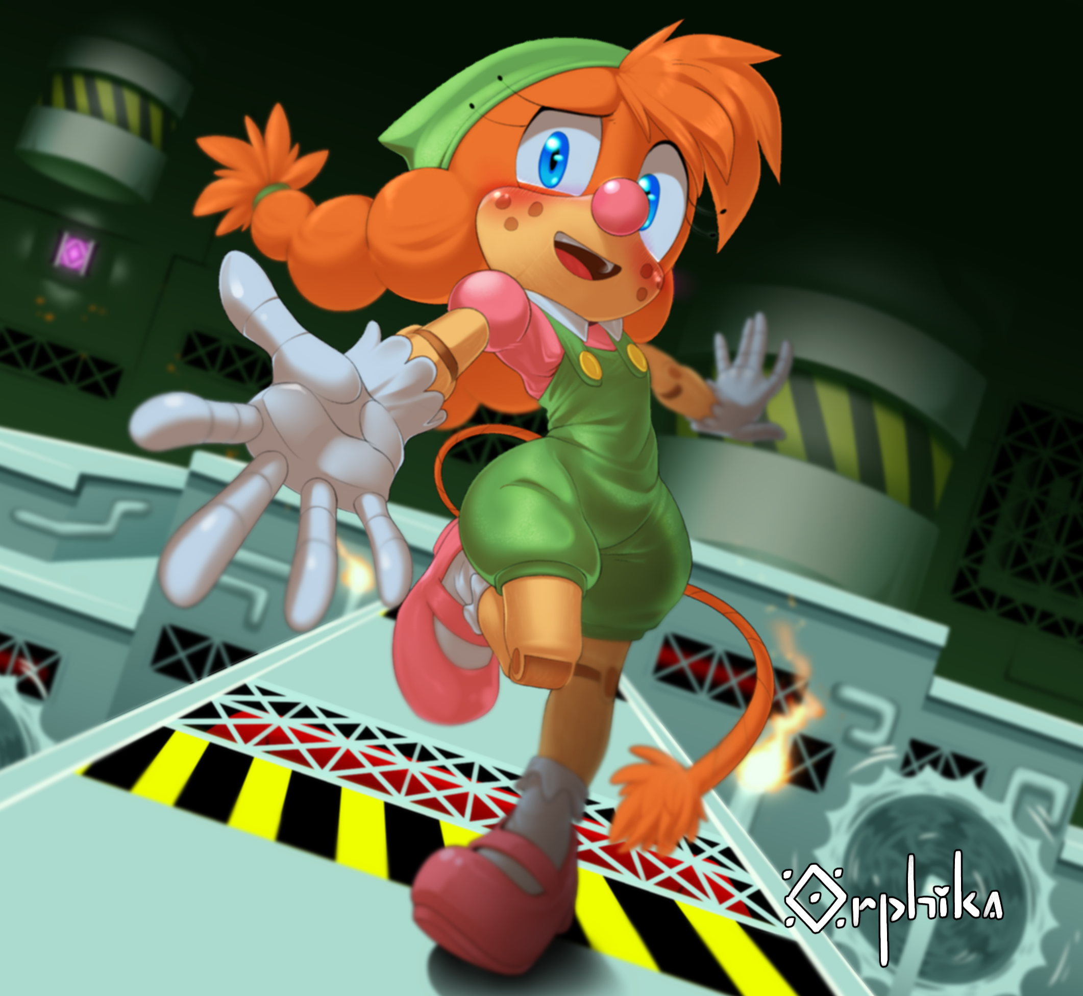 hone (sky cubes), adeleine, kirby (series), kirby 64, nintendo, 1girl, beret, canvas (object), closed eyes, hat, holding, holding paint palette, holding paintbrush, open mouth, paint palette, paintbrush, red hat, smile, smock, tree