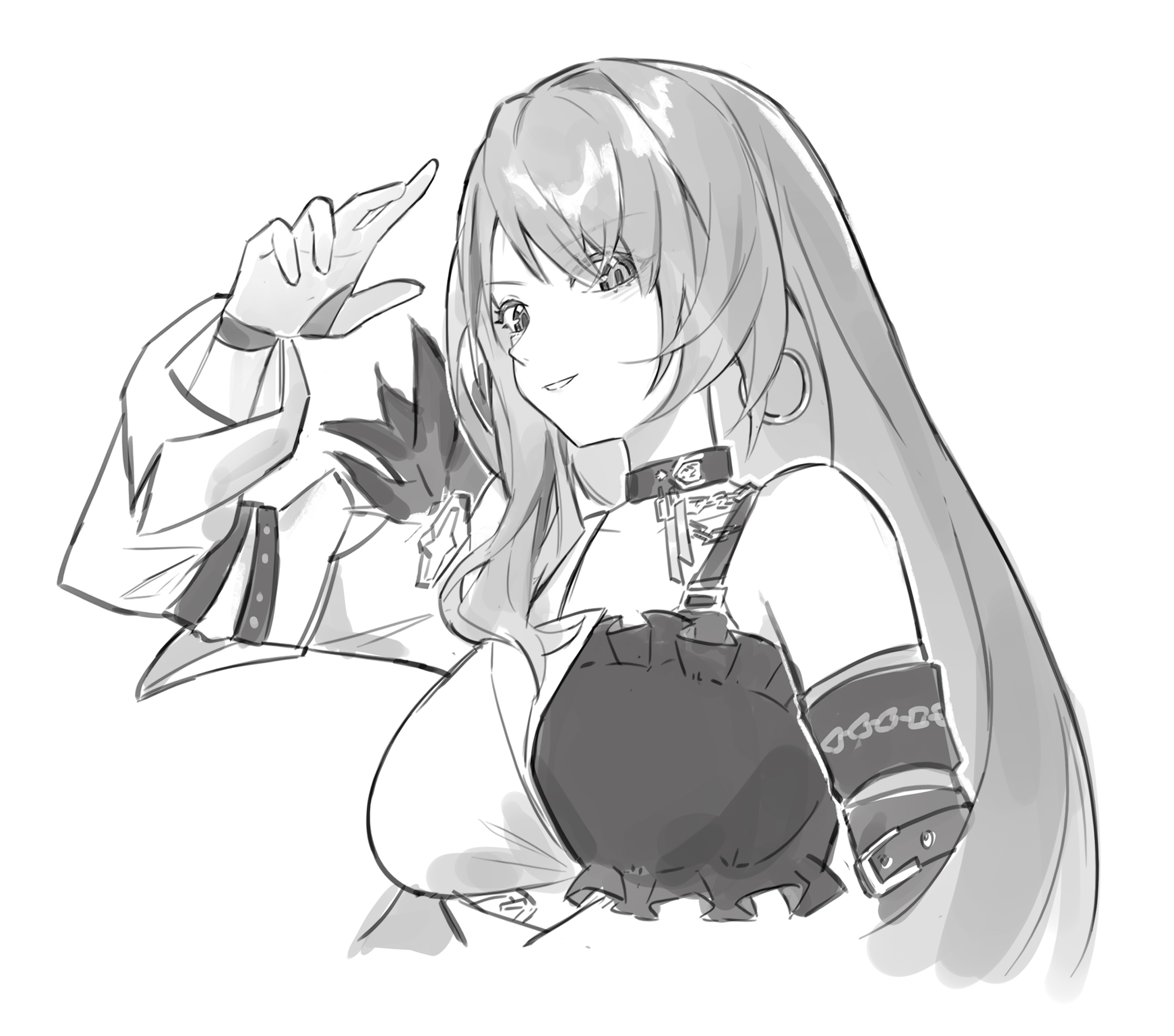 1girlasymmetrical jacketbare shouldersbreastschokercropped torsofrillsgreyscalehand upjacketlarge breastslong hairlong sleeveslooking at viewermonochromeparted bangsparted lipssimple backgroundsketchsmilesolowhite background