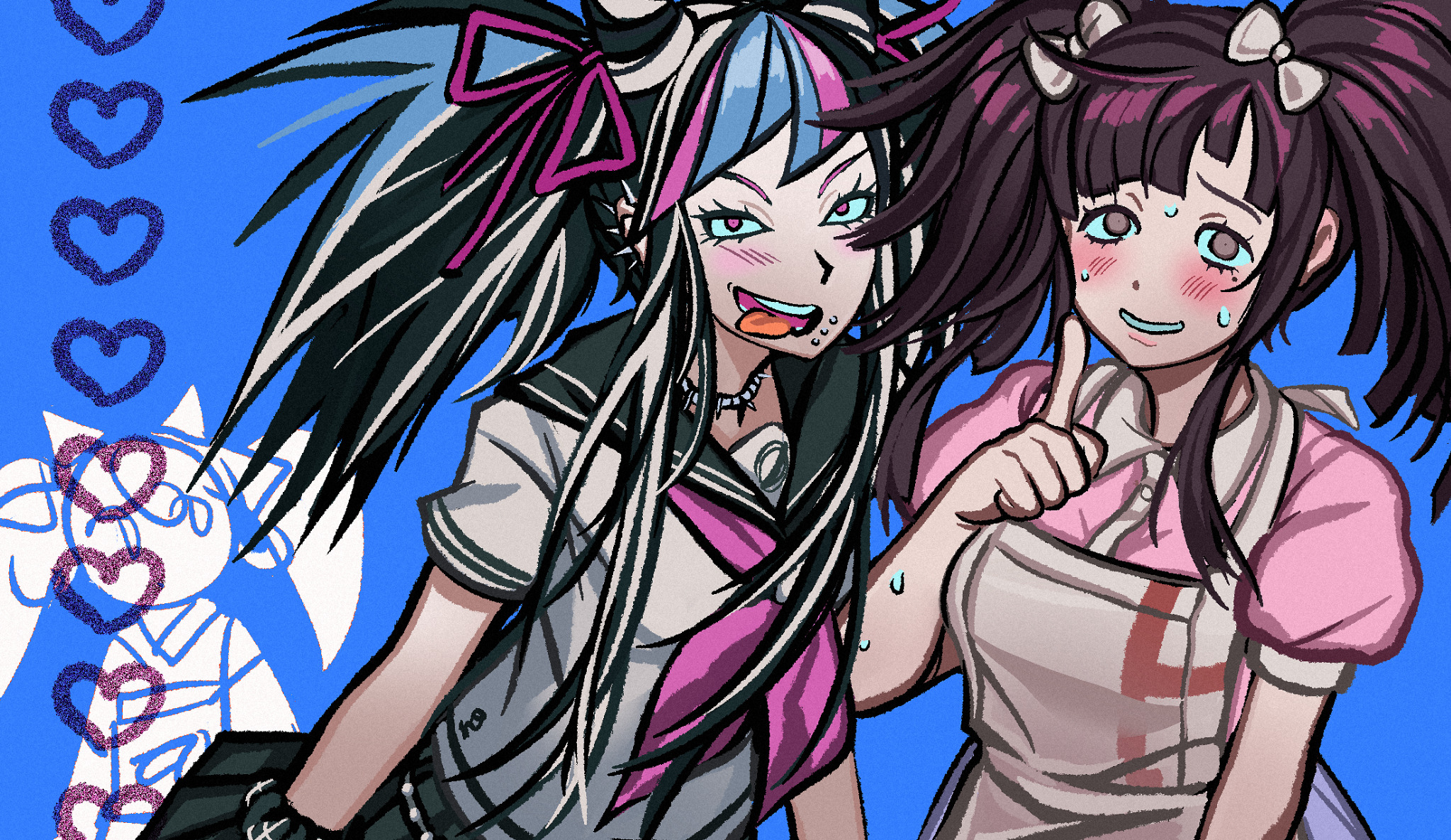 batako (batakoart), oiso, okami (manyuu hikenchou), manyuu hikenchou, highres, 2girls, blush, breast sucking, breasts, closed eyes, dark-skinned female, dark skin, female focus, gigantic breasts, grabbing another's breast, groping, lactation, long hair, multiple girls, skindentation, sweat, yuri