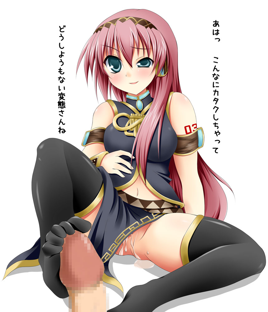1girlaqua eyescensoredcumcumdripfeetfootjobfootjob with legwearlong hairmidriffno pantiespenispink hairpovraised eyebrowsolo focusthighhighsuneven eyes
