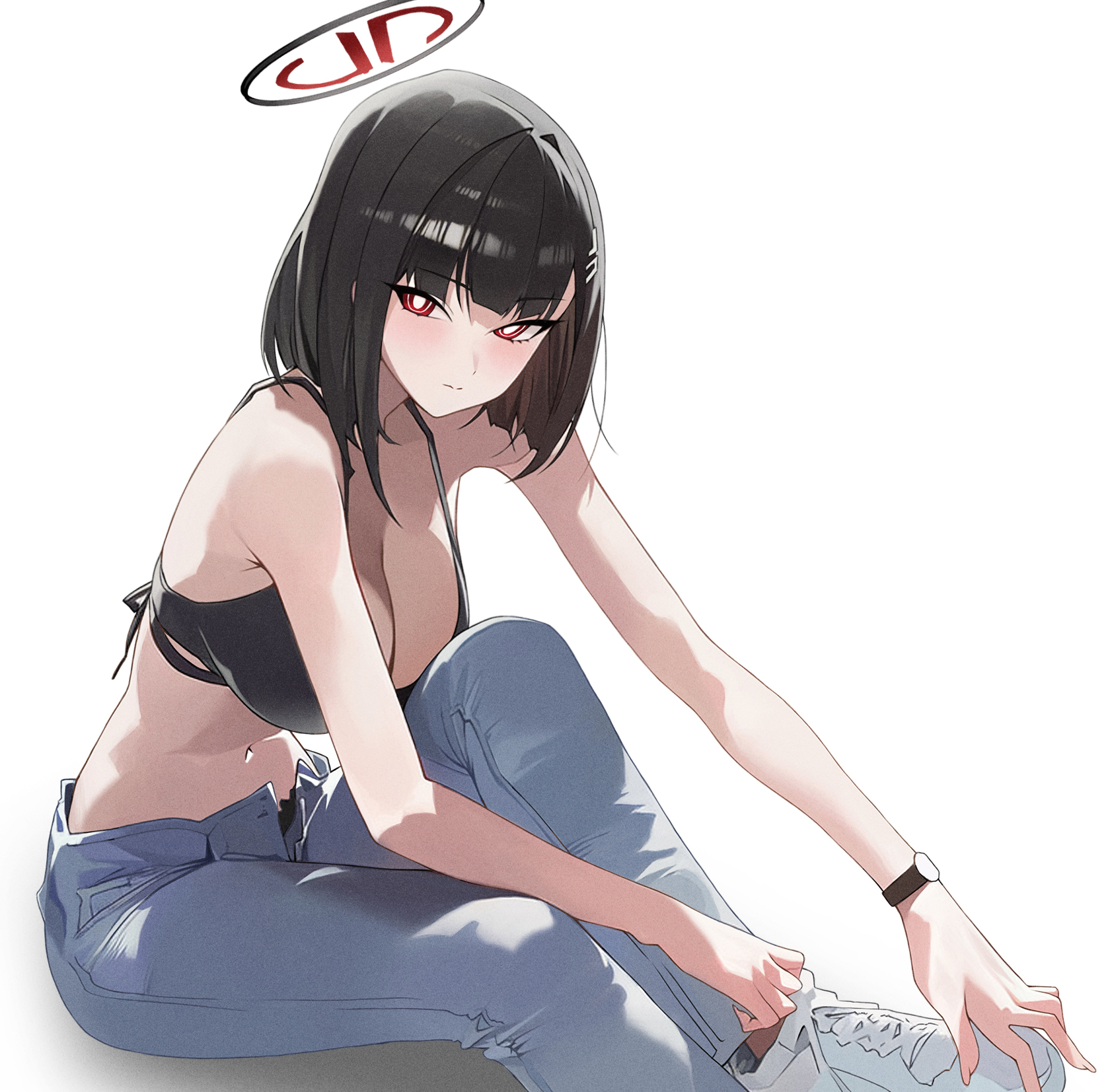 1girlalternate hair lengthalternate hairstyleblack brablack hairblue pantsbrabreastsbright pupilscleavagedenimeyelashesjeansmedium hairnavelpantsred eyesshoelacesshoessimple backgroundsittingsolostomachunderwearwatchwhite backgroundwhite pupilswhite shoeswristwatch