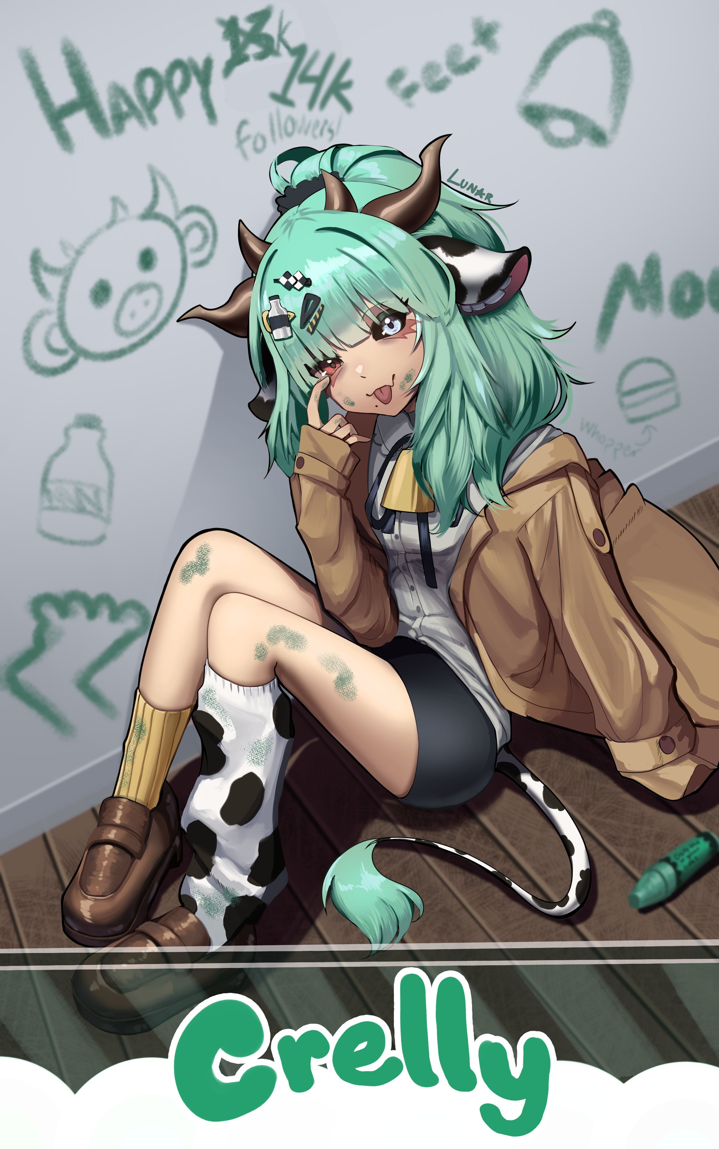 1girlanimal earsartist namebellblack ribbonblack sclerablack skirtbottle hair ornamentbrown jacketbrown shoesbuttonscharacter namecolored scleracow earscow girlcow tailcowbellcrayoncrayon drawingcrelly parfaitenglish texteyelashesfanggreen hairgrey scleraheterochromiahornsindoorsjacketlong hairlong sleeveslunar nutcasemilestone celebrationmismatched socksmolemole under mouthneck bellneck ribbonopen clothesopen jacketred eyesribbonshirtshoessittingskin fangskirtsmilesolotailtonguetongue outvirtual youtuberwhite eyeswhite shirtwooden floorwriting on wall