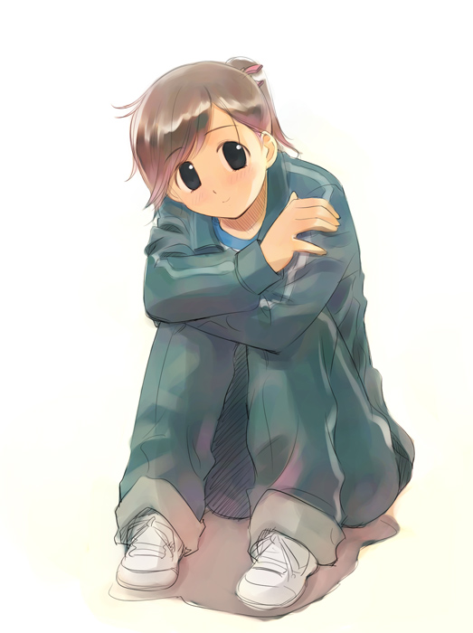 naotan, kaminogi haruka, noein, wall, 00s, 1girl, arms behind back, brown eyes, buruma, child, female focus, green buruma, gym uniform, headband, leaning, short hair, solo