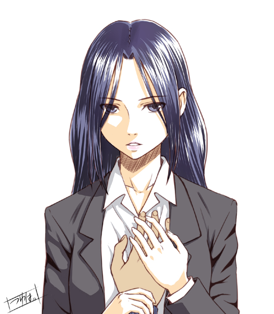 1girlblue eyesblue hairbreastsgrabbing another's breastgropingguided breast grabguiding handlong hairsmall breastssolo focus