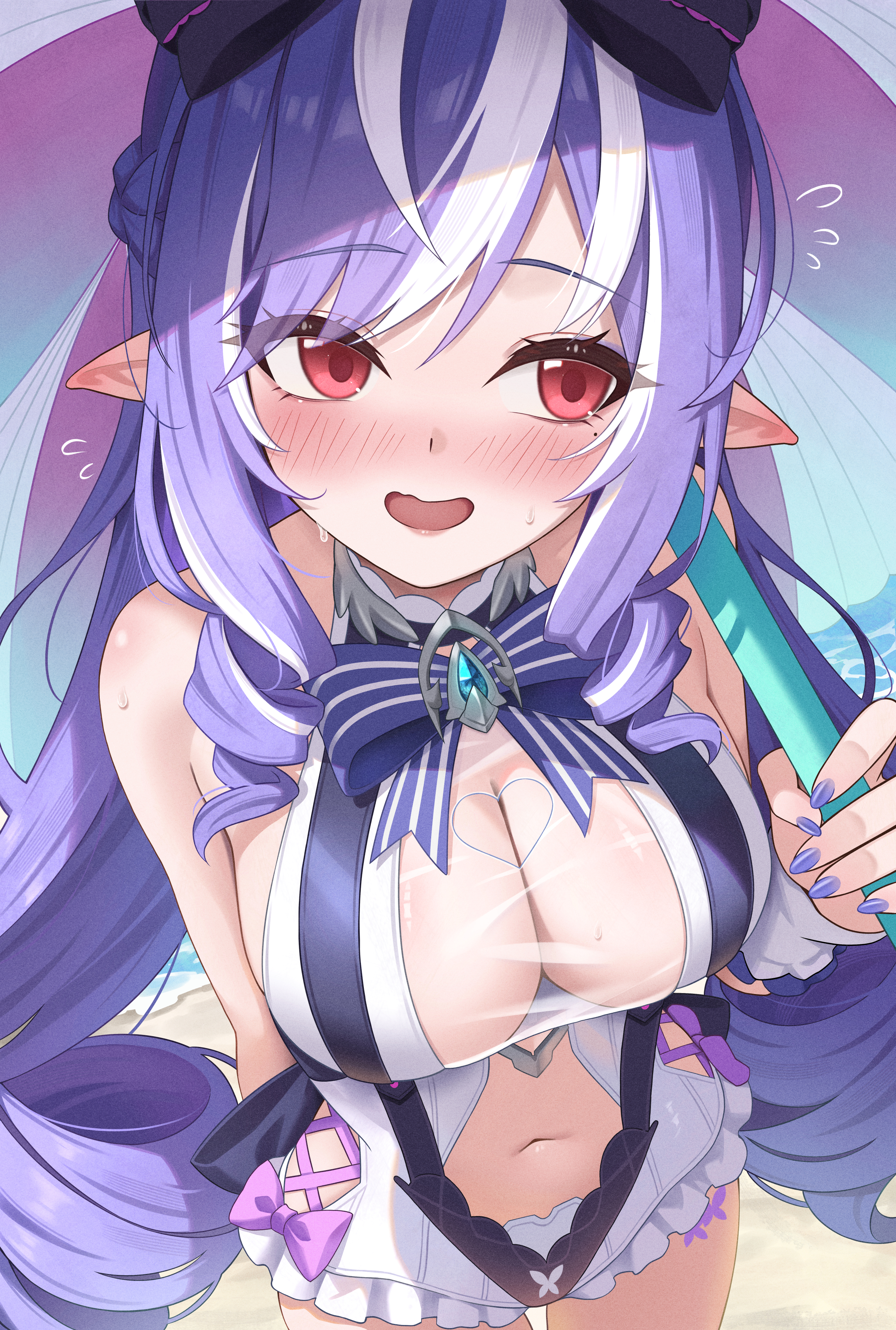 1girlaverting eyesblushbreastsclothing cutoutdrill hairflying sweatdropsfrom aboveheart cutoutlarge breastslong hairmolemole under eyemulticolored hairnavelone-piece swimsuitpointy earspurple hairred eyessolostomachstreaked hairsweatdropswimsuitumbrella over shoulderwhite hairwhite one-piece swimsuit