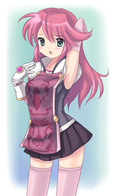 1girlaqua backgroundarmpitsblushelbow glovesfemale focusglovesgradient backgroundgreen eyeslong hairmolemole under eyepink hairpink thighhighsskirtsolotabardthighhighs