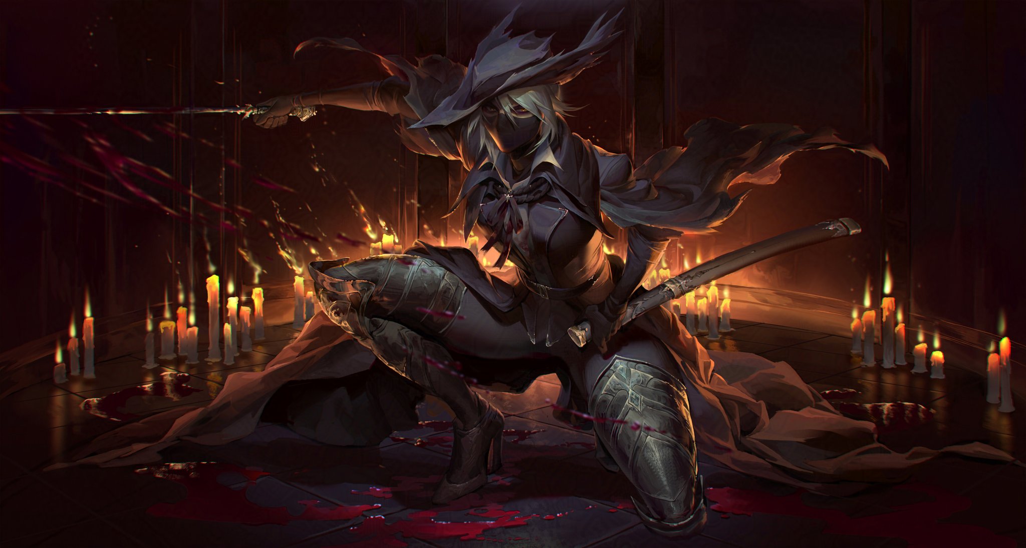 1girlblack bootsblack coatblack glovesblonde hairbloodblood splatterbloody weaponbootsbreastscandlecoatgloveshair between eyeshathigh heel bootshigh heelsholdingholding swordholding weaponlong hairlooking at viewermedium breastsscabbardsheathsoloswordthigh bootstorn clothestorn hatunsheathedweapon