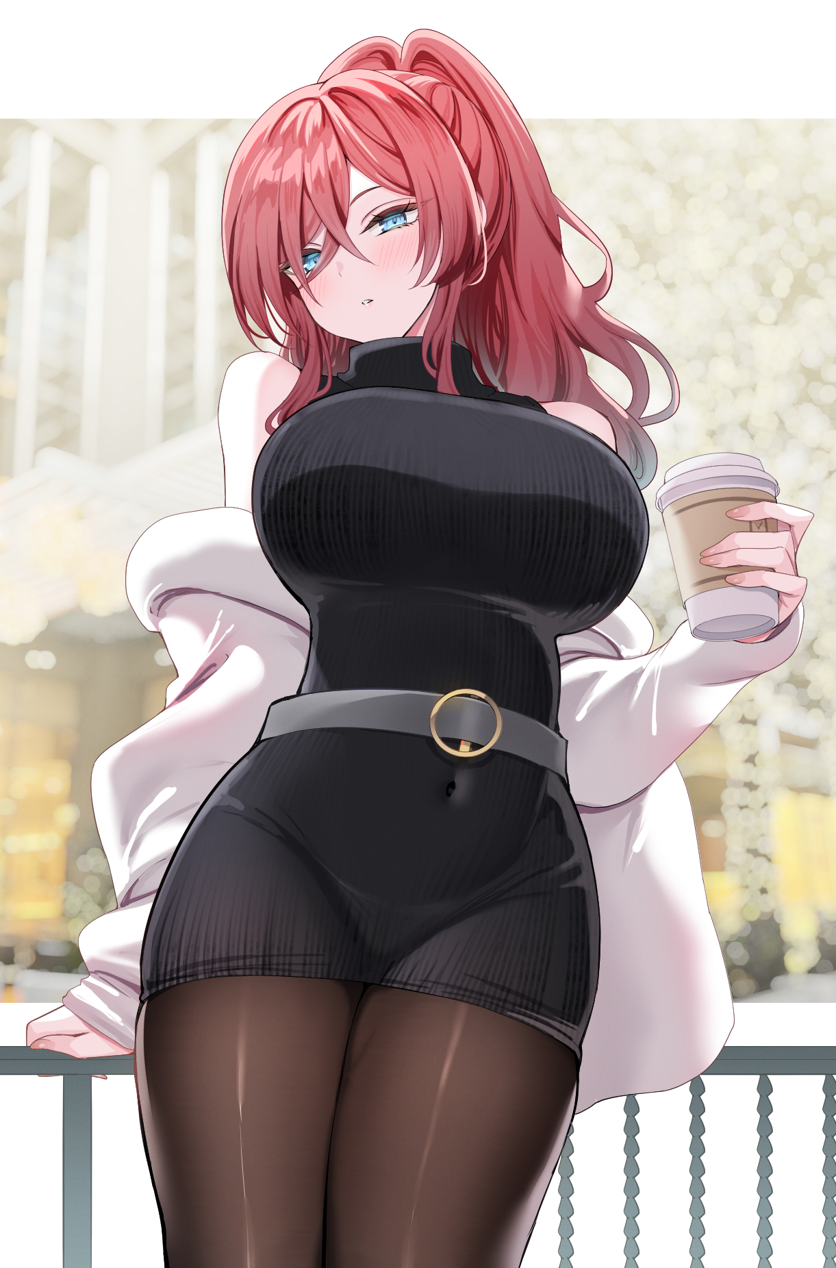 1girlaqua eyesbare shouldersbeltblack dressblack pantyhoseblurryblushbreastscoffeecovered navelcrossed bangsdepth of fielddressfencehair between eyesholdinglarge breastslong hairlong sleeveslooking at vieweroutdoorspantyhoseparted lipsponytailred hairsidelockssleevelesssleeveless dresssolosweaterturtleneckturtleneck dresswhite sweater