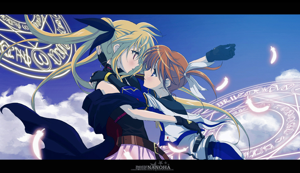 2girlsbeltblonde hairblue eyesblushbrown haircapeeye contactfeathersfingerless glovesgloveshair ribbonhugletterboxedlong hairlooking at anothermagic circlemiko embracemultiple girlsparodyred eyesribbonshort twintailsskytwintailsyuri