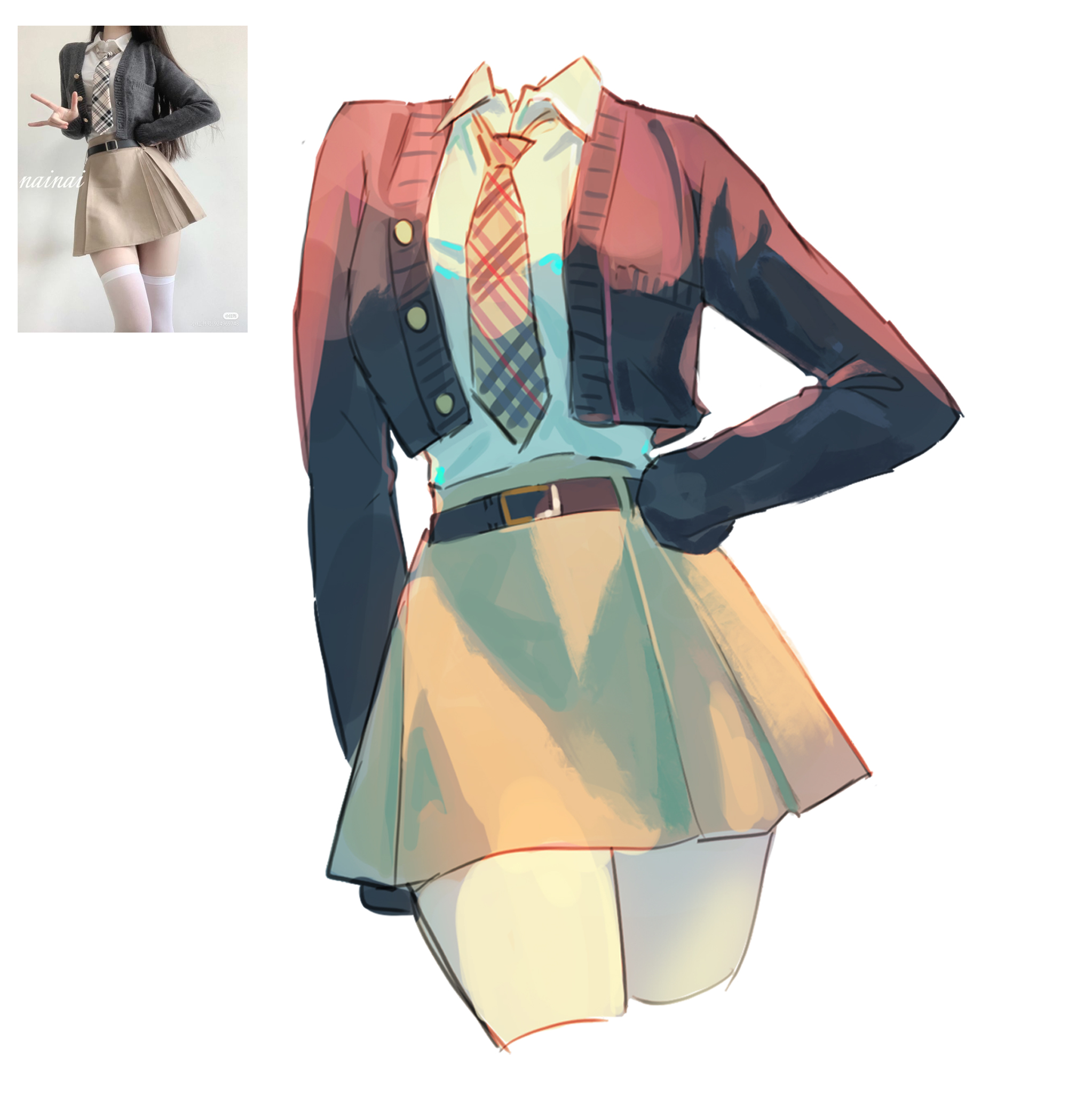 1girlbeltbelt buckleblack beltbucklecardigancollared shirtcropped legsgrey cardiganhand on own hiplong sleevesnecktieopen cardiganopen clothesphoto insetreference insetshirtsimple backgroundskirtsolowhite backgroundwhite shirtyellow necktieyellow skirt
