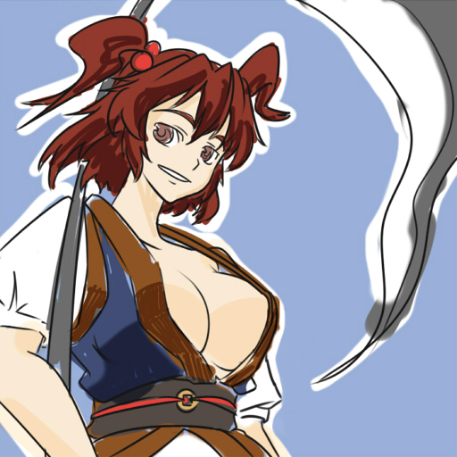 1girlbreastsfemale focuslarge breastsopen clothesopen shirtred eyesred hairscytheshirtshort hairsolotwintailstwo side up