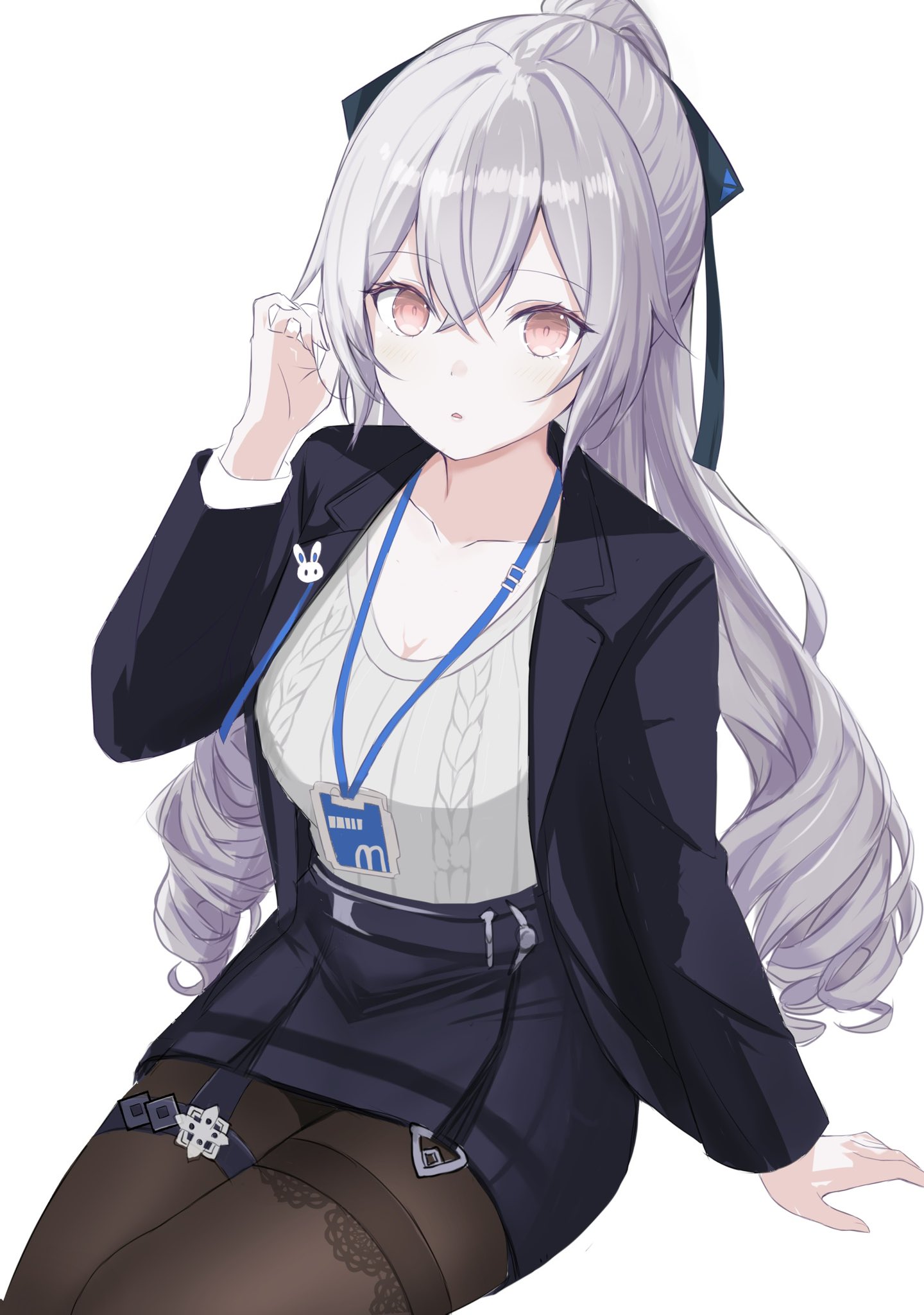 1girlblack coatblack pantyhoseblack skirtbreastscoatdrill hairgrey hairgrey sweaterid cardlarge breastslong hairlooking at viewerofficial alternate costumeorange eyespantyhosepencil skirtribbed sweatersimple backgroundskirtsolosweatervery long hairwhite background
