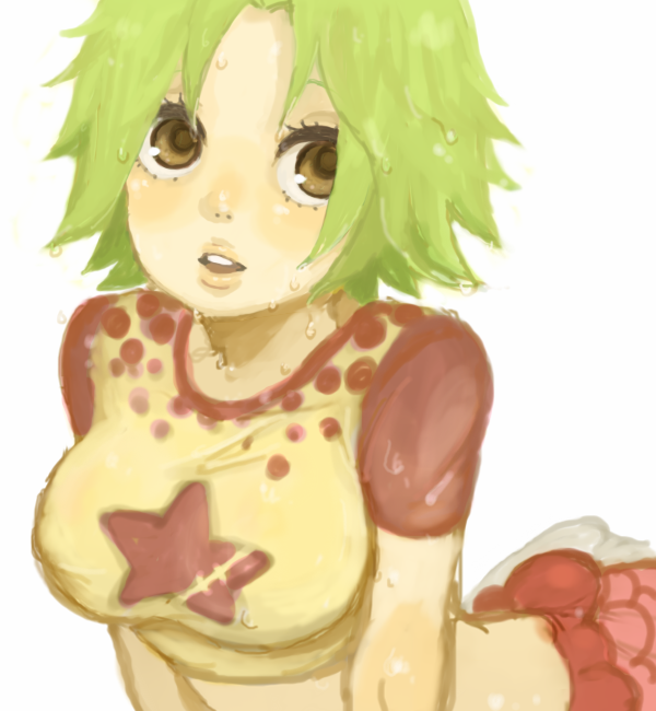 1girlarched backarm supportblushbreastsbrown eyescrop topfemale focusgreen hairleaning forwardlipslooking at viewermermaidmonster girlparted lipsraglan sleevesscalesshirtshort hairsimple backgroundsolostar (symbol)t-shirtwetwhite background