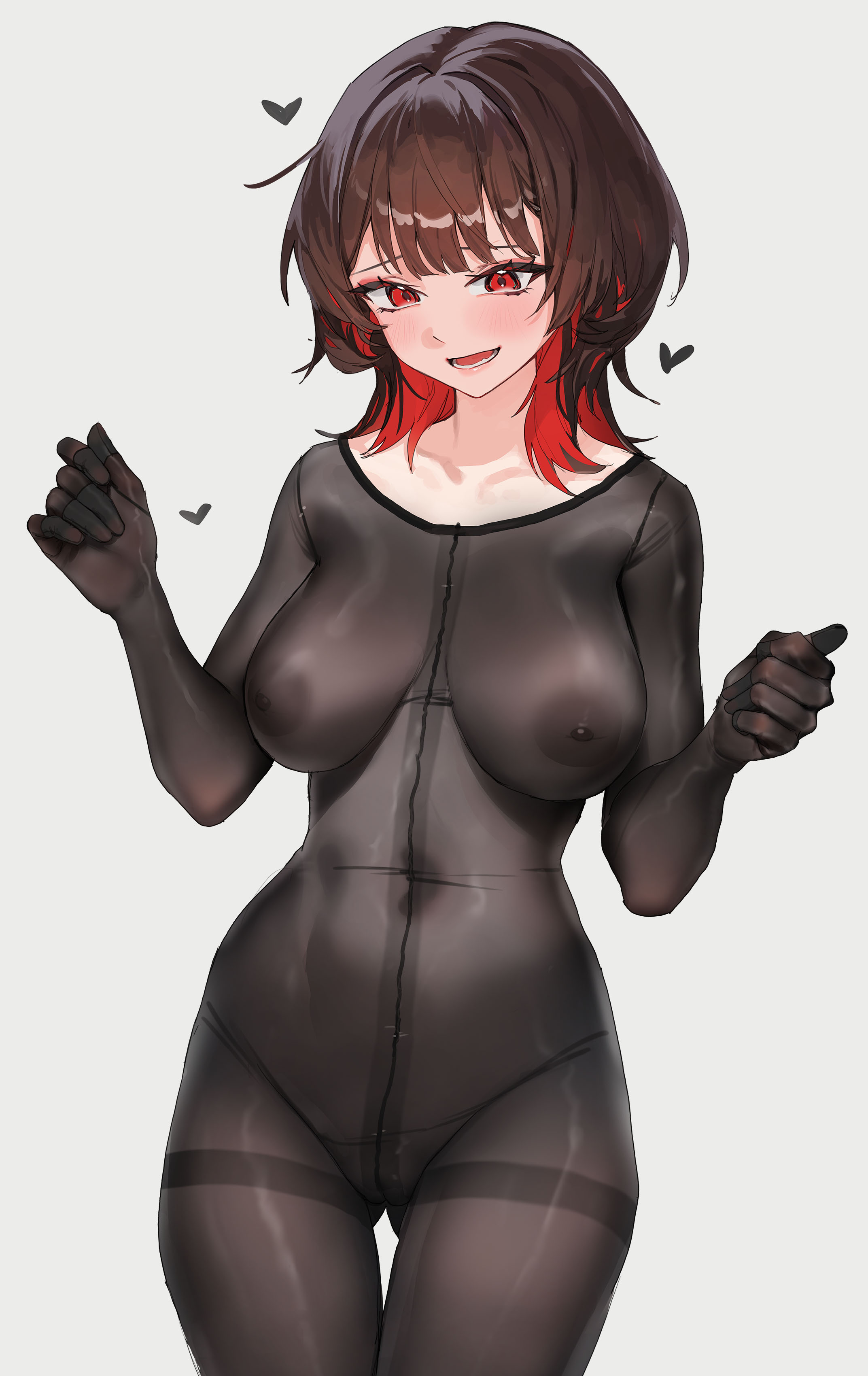 1girlbodystockingbreastsbrown haircolored inner haircovered erect nipplescovered navelgluteal foldgrey backgroundheartlarge breastslooking at viewermedium hairmulticolored hairnipplesopen mouthred eyessagging breastssimple backgroundsmilesolothigh gaptwo-tone hair