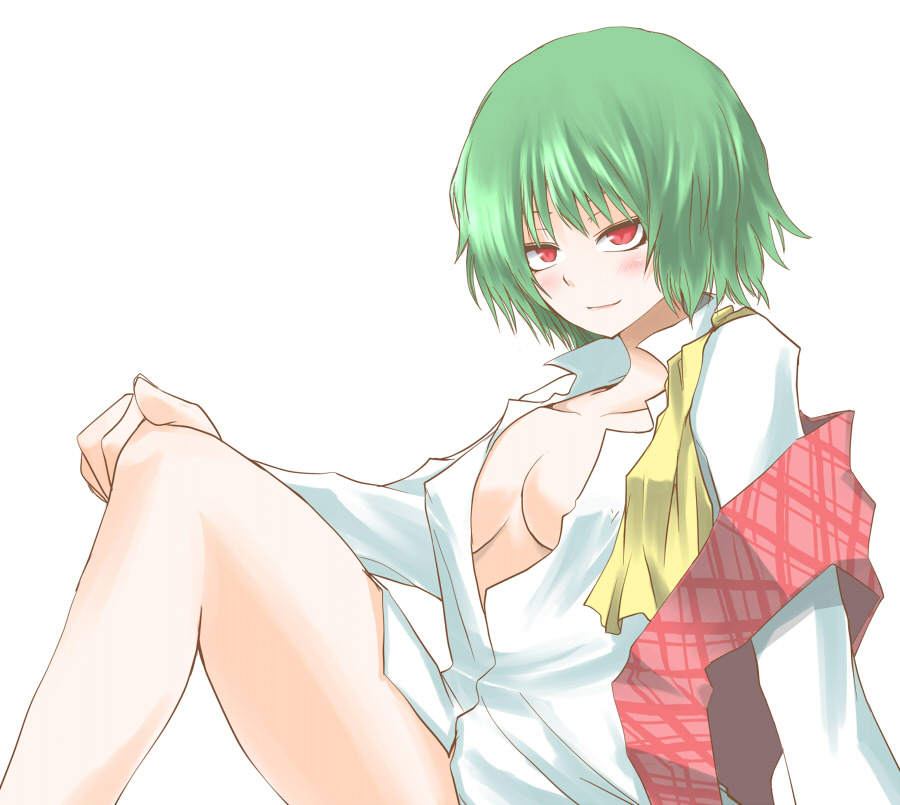 1girlascotblushbreastscleavagecovered erect nipplesfemale focusgreen hairlegsmedium breastsno braopen clothesopen shirtplaid clothesplaid vestred eyesseductive smileshirtshort hairsimple backgroundsmilesolovestwhite background