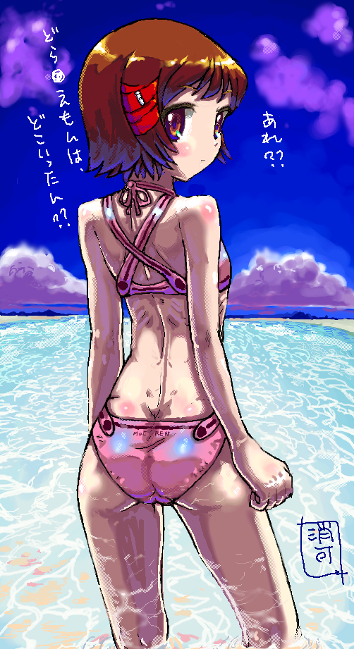 assbikiniblushbrown eyesbrown hairdaylooking backoceanoekakipink bikiniribsshort hairskinnysoloswimsuit