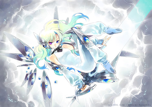 aqua hairbodysuitclouddetached sleevesheterochromiahuge weaponlong hairmechanical wingsskysoloswordweaponwings