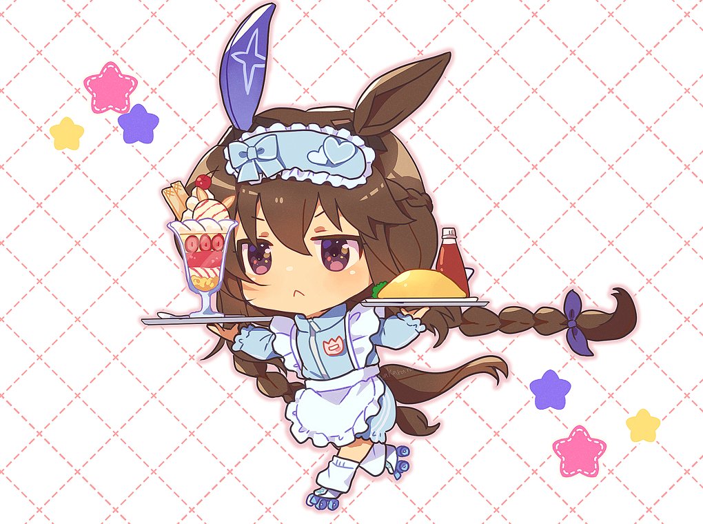 1boy1girlanimal earsapronblue jacketbrown hairchibichibi onlyclosed mouthcupdrinking glassear coversfoodfrilled apronfrillsfull bodygrid backgroundholdingholding trayhorse earshorse girlhorse tailjacketjersey maidketchup bottlelong hairlong sleevesmaidname tagomeletomuriceoutlineparfaitpink outlineroller skatesshoessingle ear coverskatessleep masksockssolostandingstanding on one legstar (symbol)tailtrack jackettrayunconventional maidv-shaped eyebrowswhite apronwhite backgroundwhite shoeswhite socks