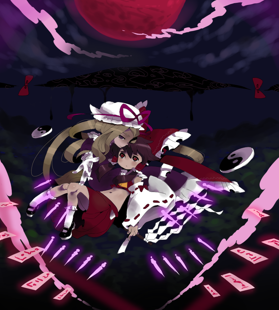 2girlsblonde hairbrown hairdanmakudetached sleevesfemale focusfull moongoheihatjapanese clotheslong hairmidriffmikomoonmultiple girlsred eyesred moonribbonskirt